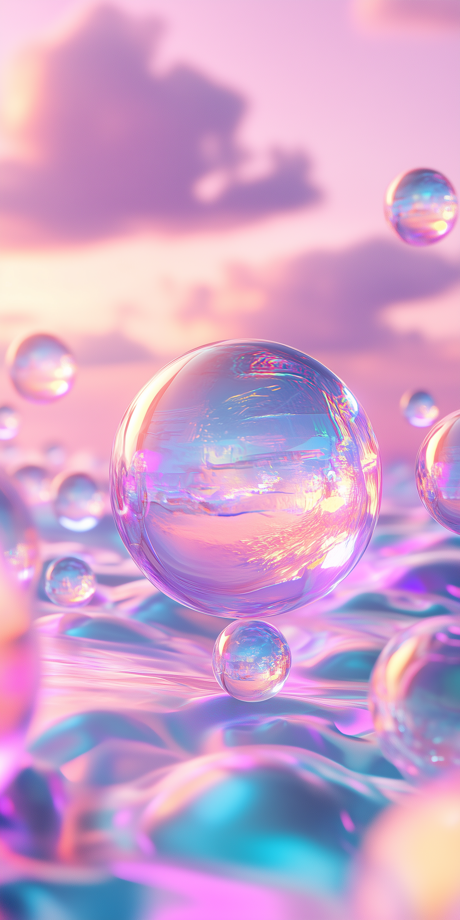 Dreamy iridescent bubbles float over a pastel liquid surface, reflecting pink, purple, and blue hues under a soft sunset sky.