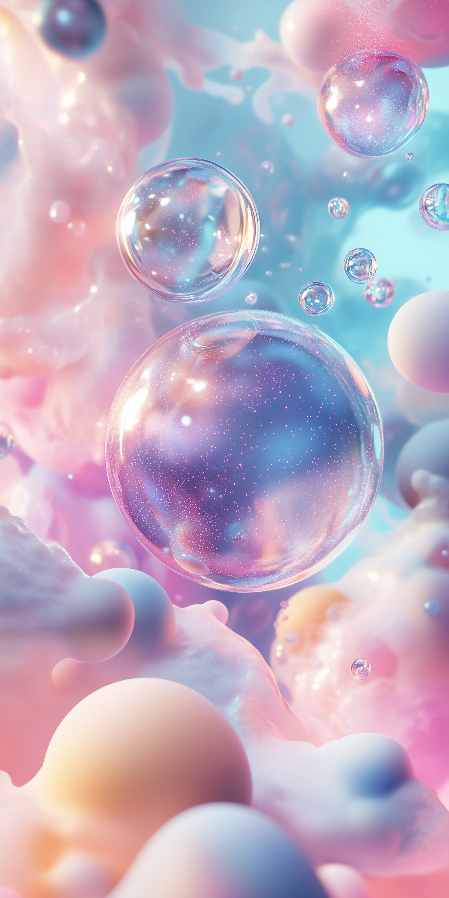 Whimsical pastel bubbles and fluffy clouds create a dreamy, ethereal scene with soft lighting and sparkling details.
