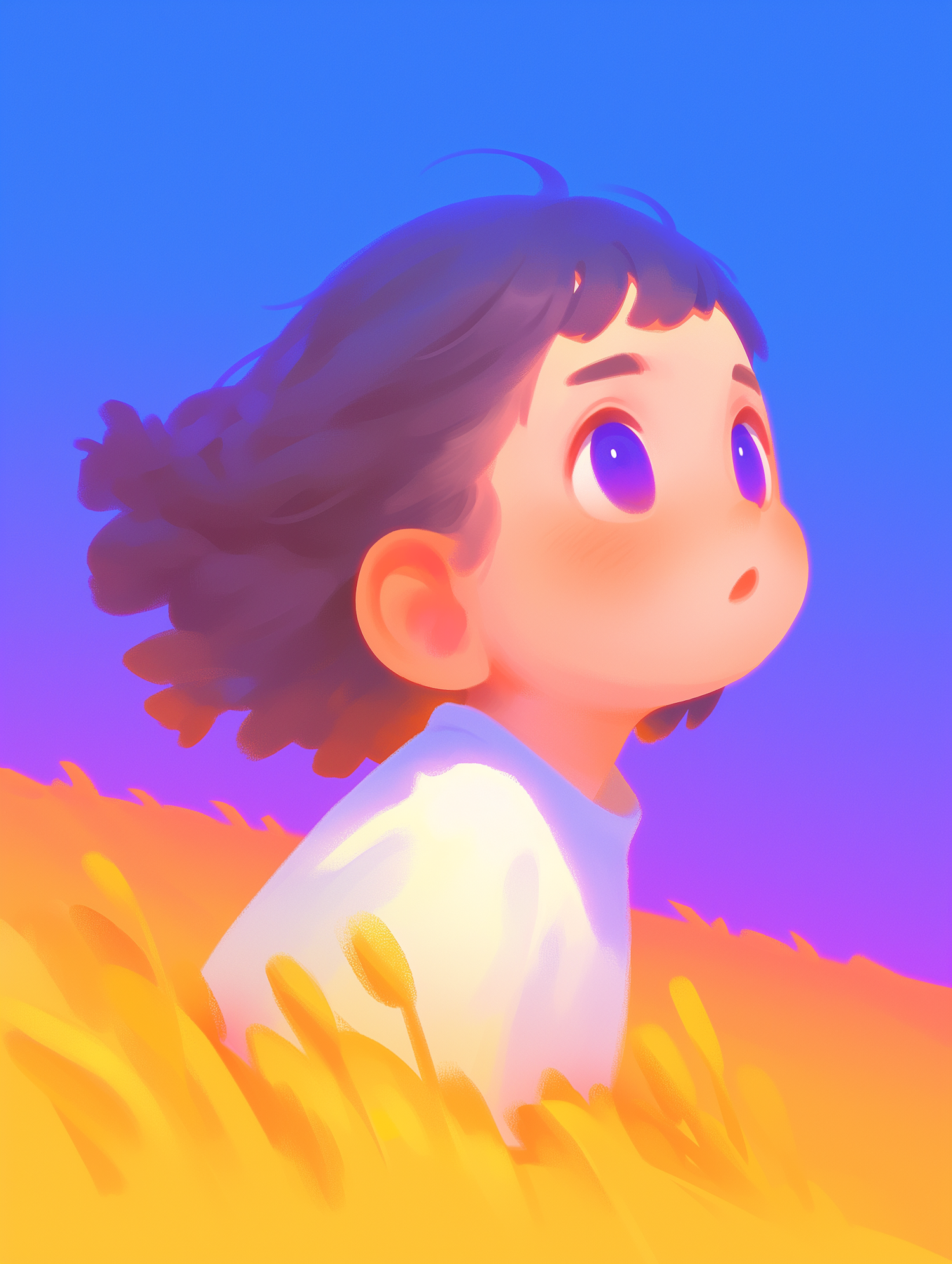 A vibrant illustration of a child gazing upward, surrounded by golden grass under a gradient sky, evoking curiosity and wonder.