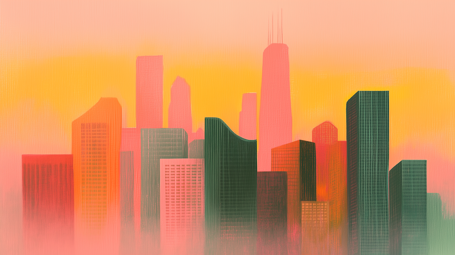 Dreamy city skyline illustration with vibrant green, red, and orange hues against a yellow-pink gradient background.