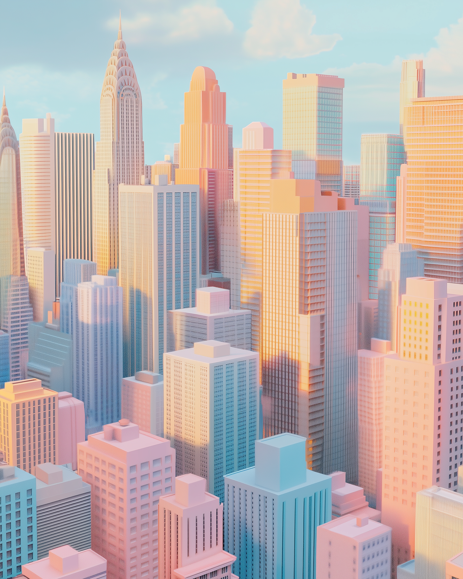 A pastel cityscape with stylized skyscrapers in pink, blue, and yellow hues, bathed in warm sunlight under a serene blue sky.