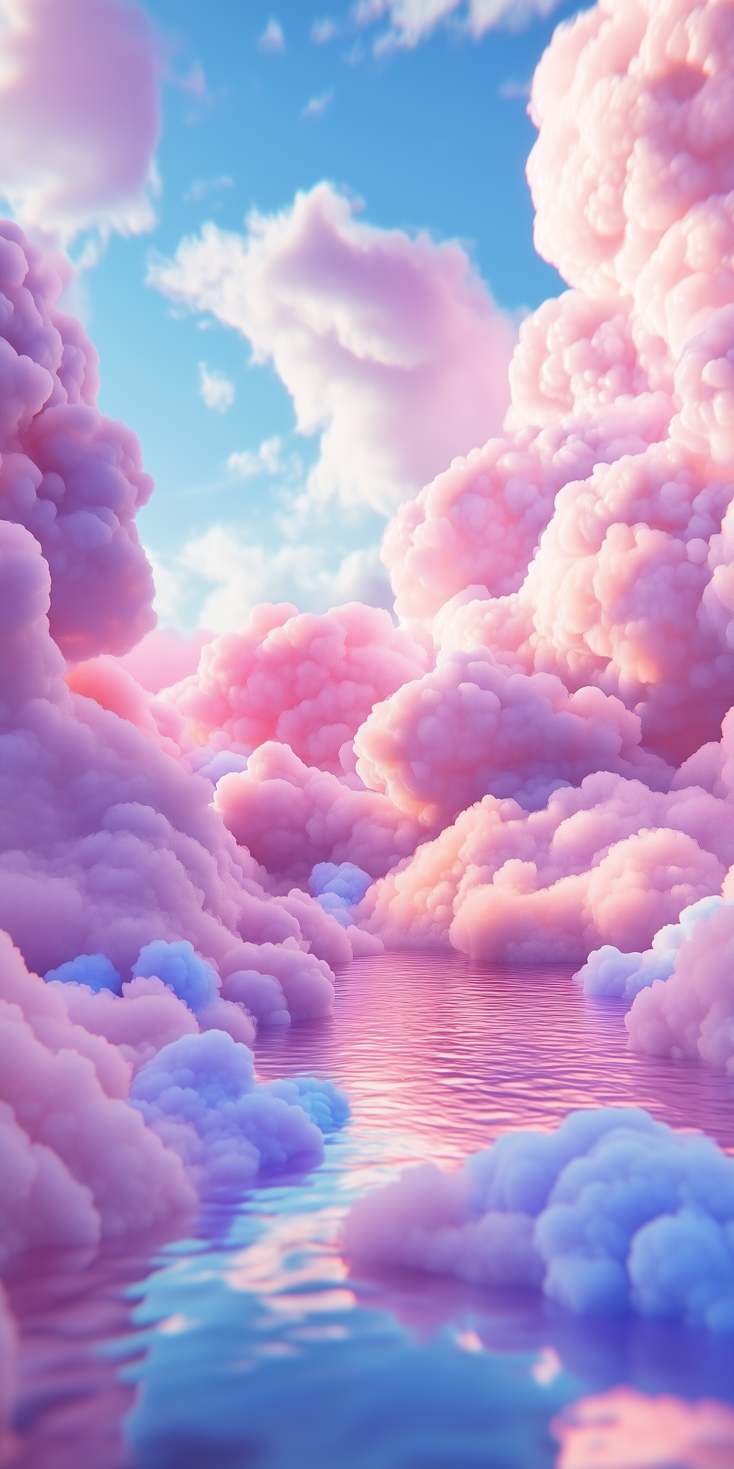 Dreamy pastel clouds in pink and blue float above a reflective water surface, creating a serene and ethereal atmosphere.