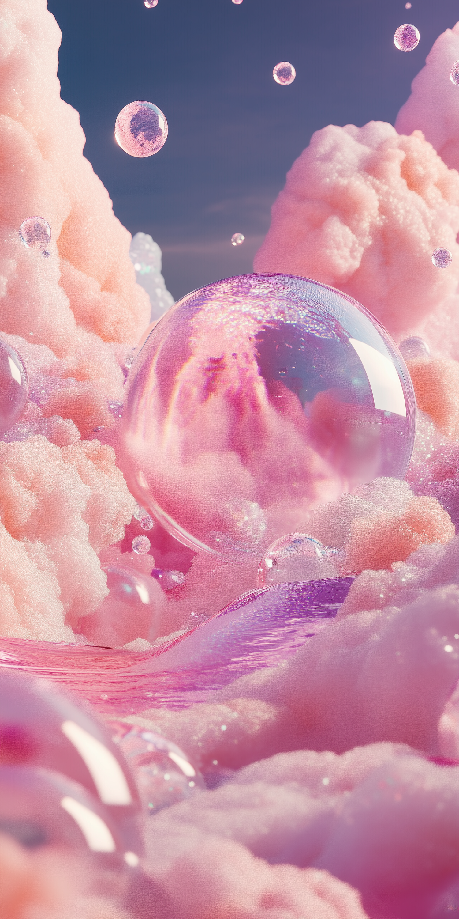 Dreamy pink clouds and iridescent bubbles create a magical, surreal scene with soft textures and pastel hues. Perfectly whimsical!