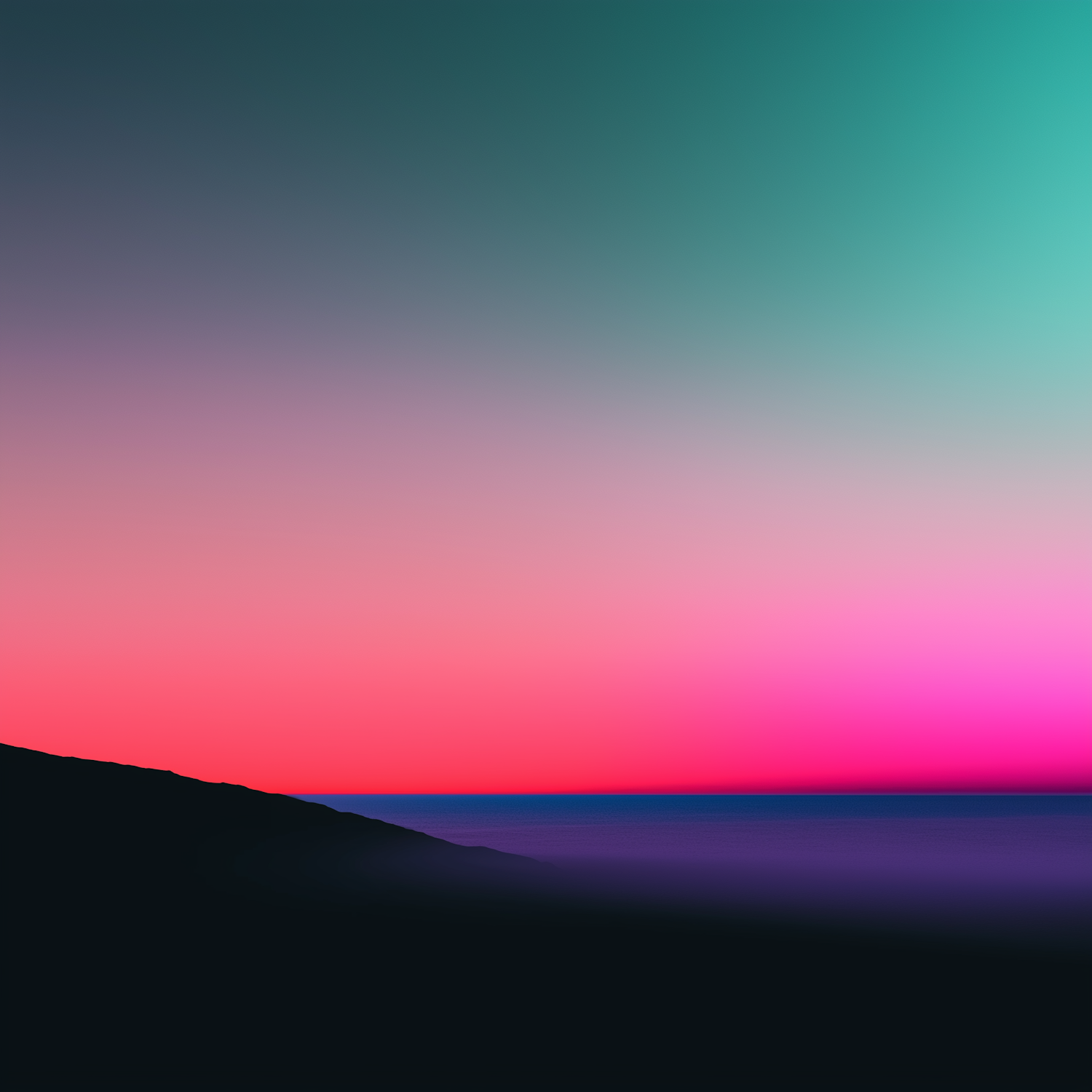A dreamy gradient sky with teal, pink, and purple hues over a silhouetted hill, evoking a serene and surreal atmosphere.