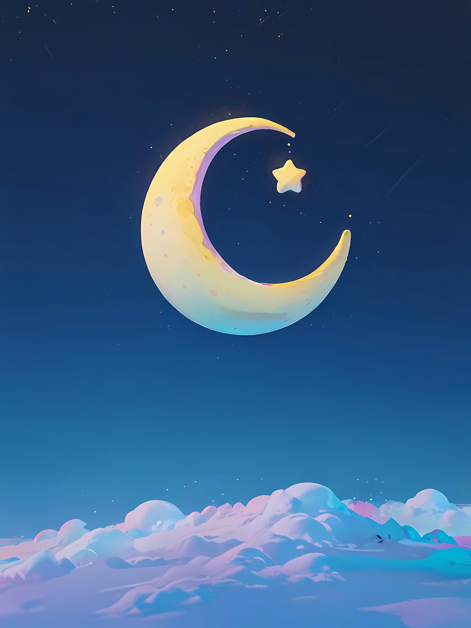 Dreamy crescent moon and star glowing in a serene night sky with pastel clouds and twinkling stars. Perfect for a magical, calming vibe.