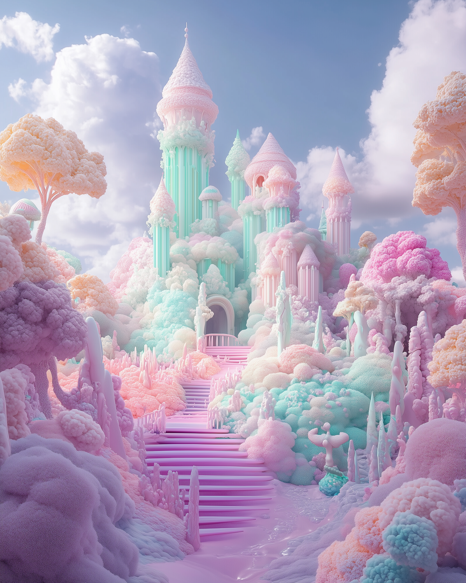 A pastel dream castle with cloud-like trees, mint towers, and pink stairs under a blue sky. A whimsical, fairy-tale-like scene.