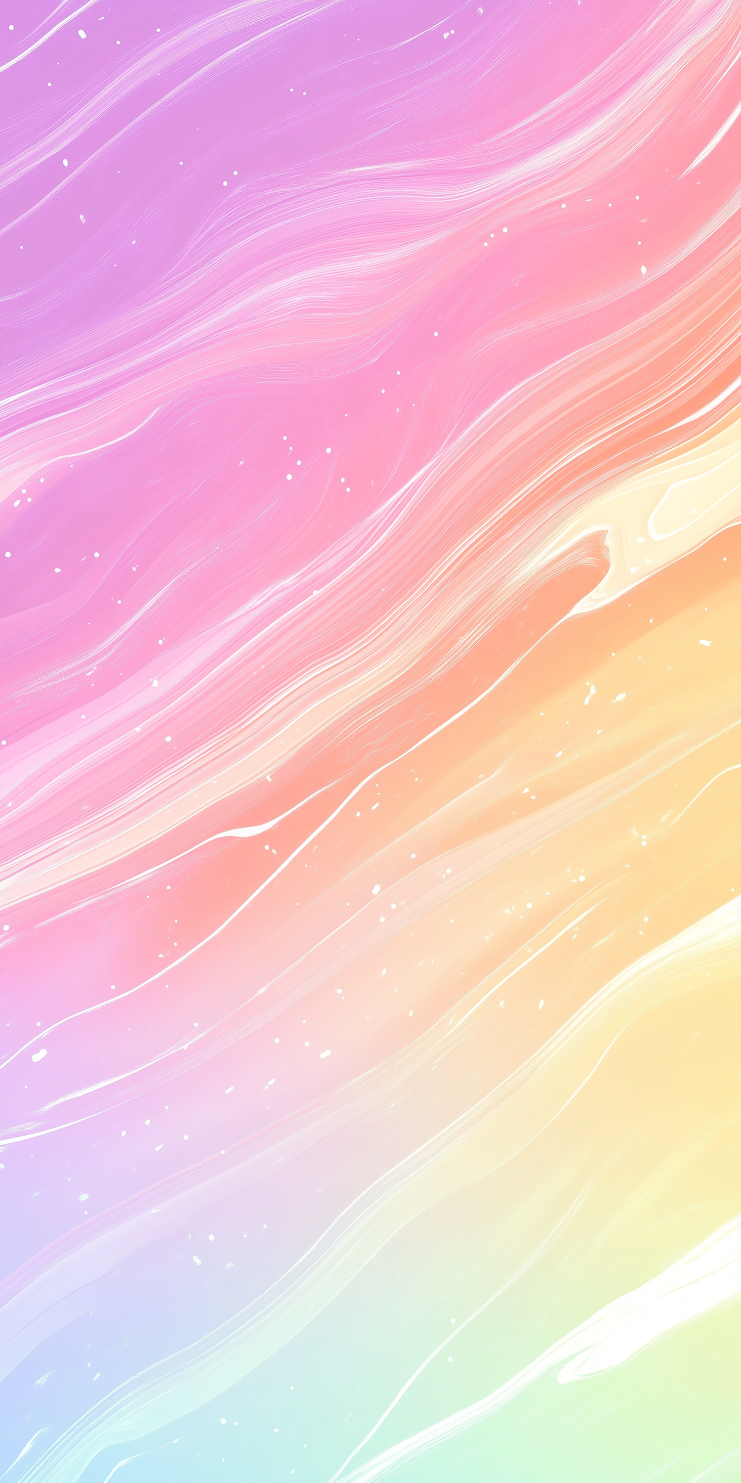 Dreamy pastel gradient with flowing wavy lines and scattered white specks, blending pink, purple, orange, yellow, and green hues.