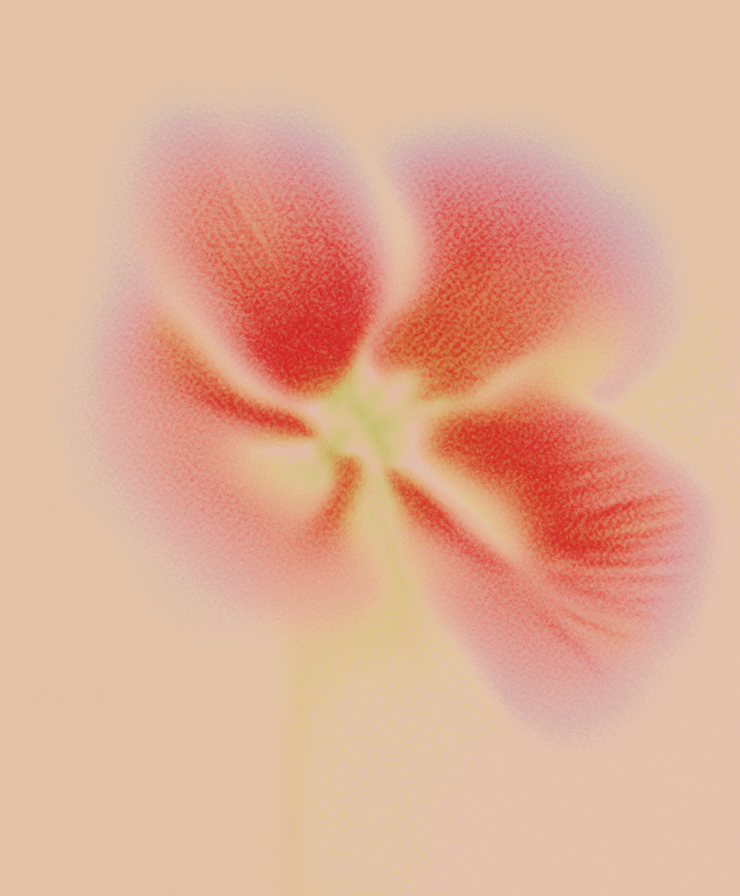 A dreamy, soft-focus image of a red flower with a green center on a pale peach background, evoking a serene and artistic vibe.