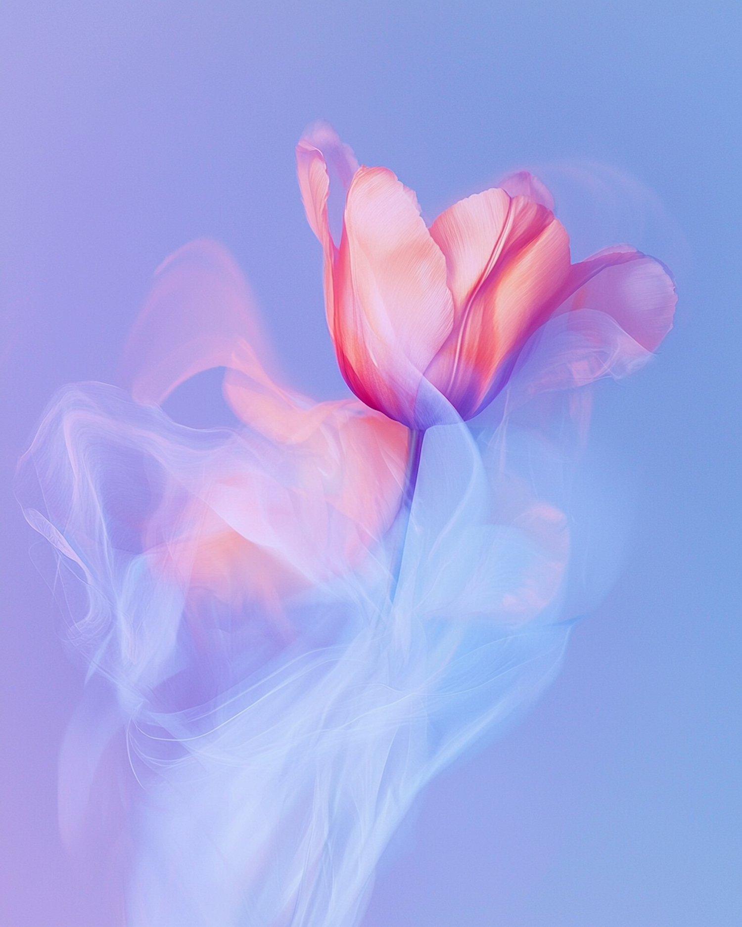 A dreamy tulip with pink-orange petals surrounded by pastel mist on a blue gradient background, blending realism and surrealism beautifully.