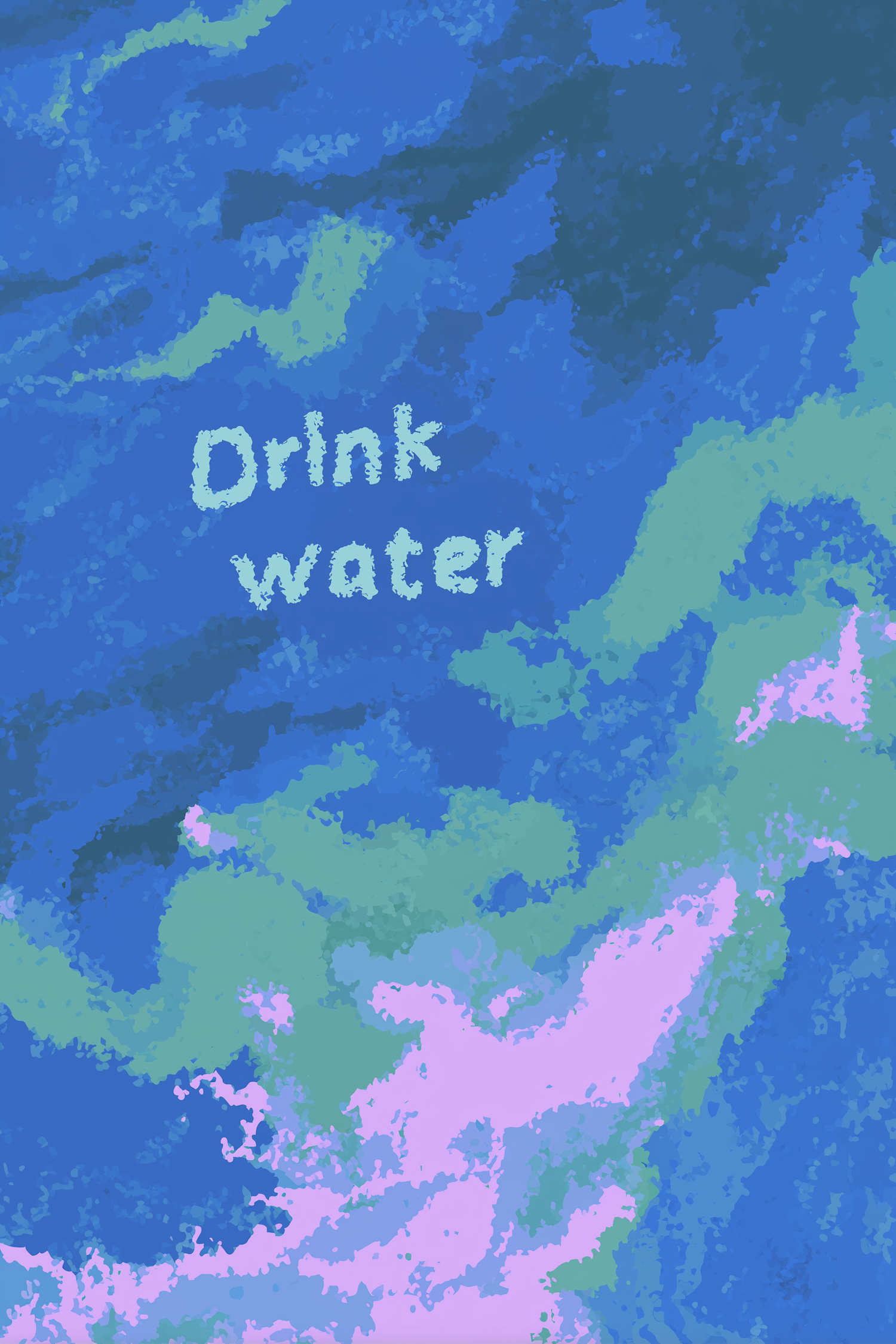 Abstract art with blue, green, and purple tones featuring the text 'Drink water' in a playful font. A reminder to stay hydrated.