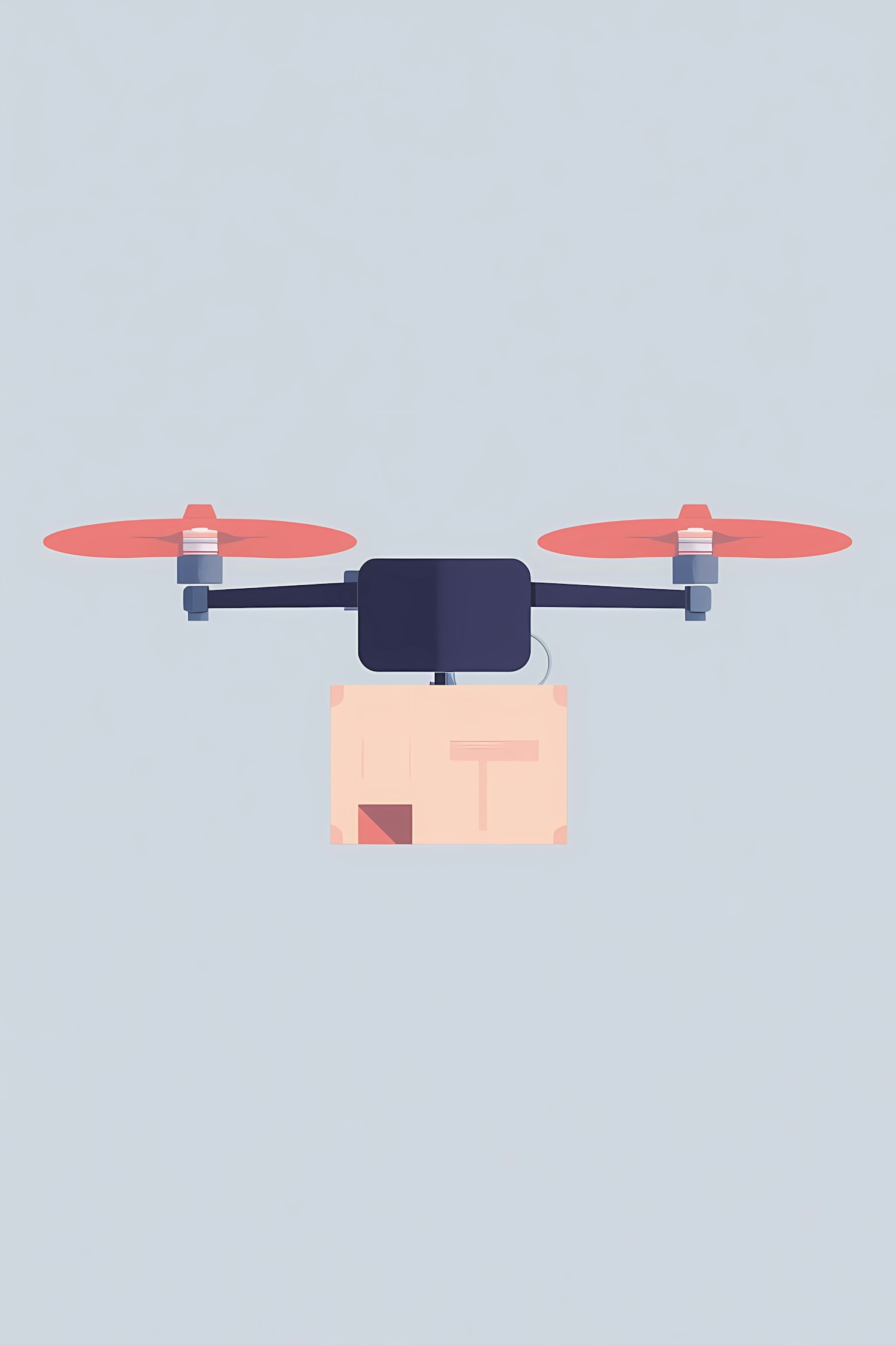 Minimalistic illustration of a drone with red propellers carrying a beige package, set against a light gray background.