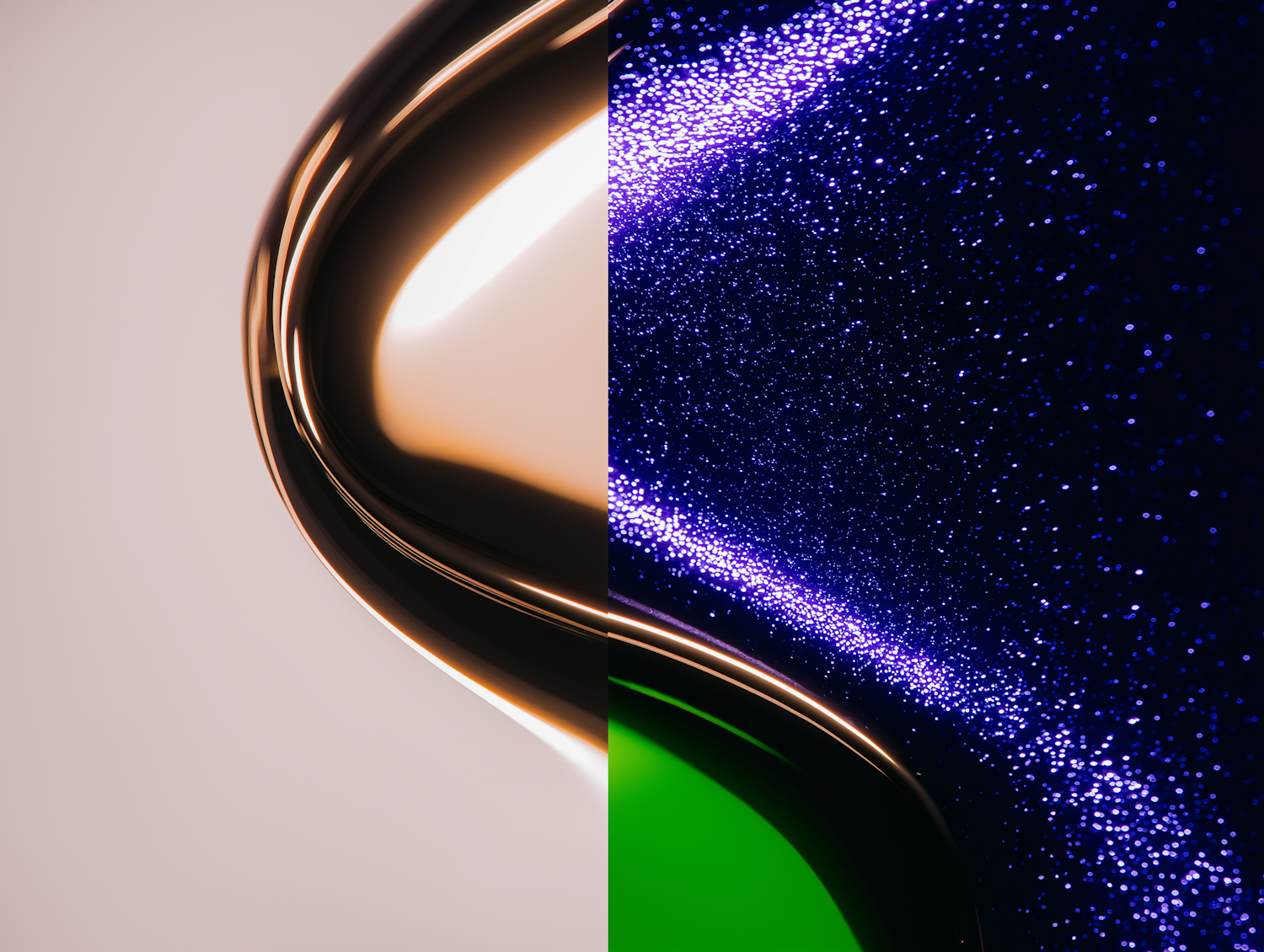 A split image with a golden metallic curve on one side and a sparkling blue texture on the other, creating a striking visual contrast.