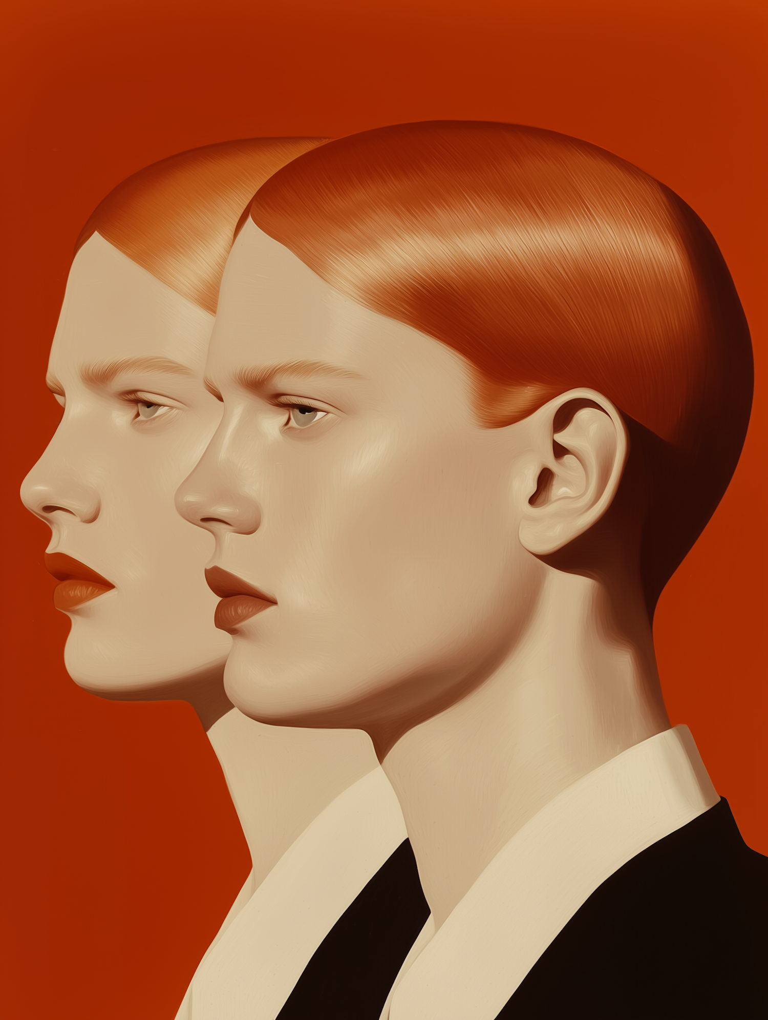 Elegant side profile of two individuals with red hair against a warm orange background, showcasing symmetry and sleek style.