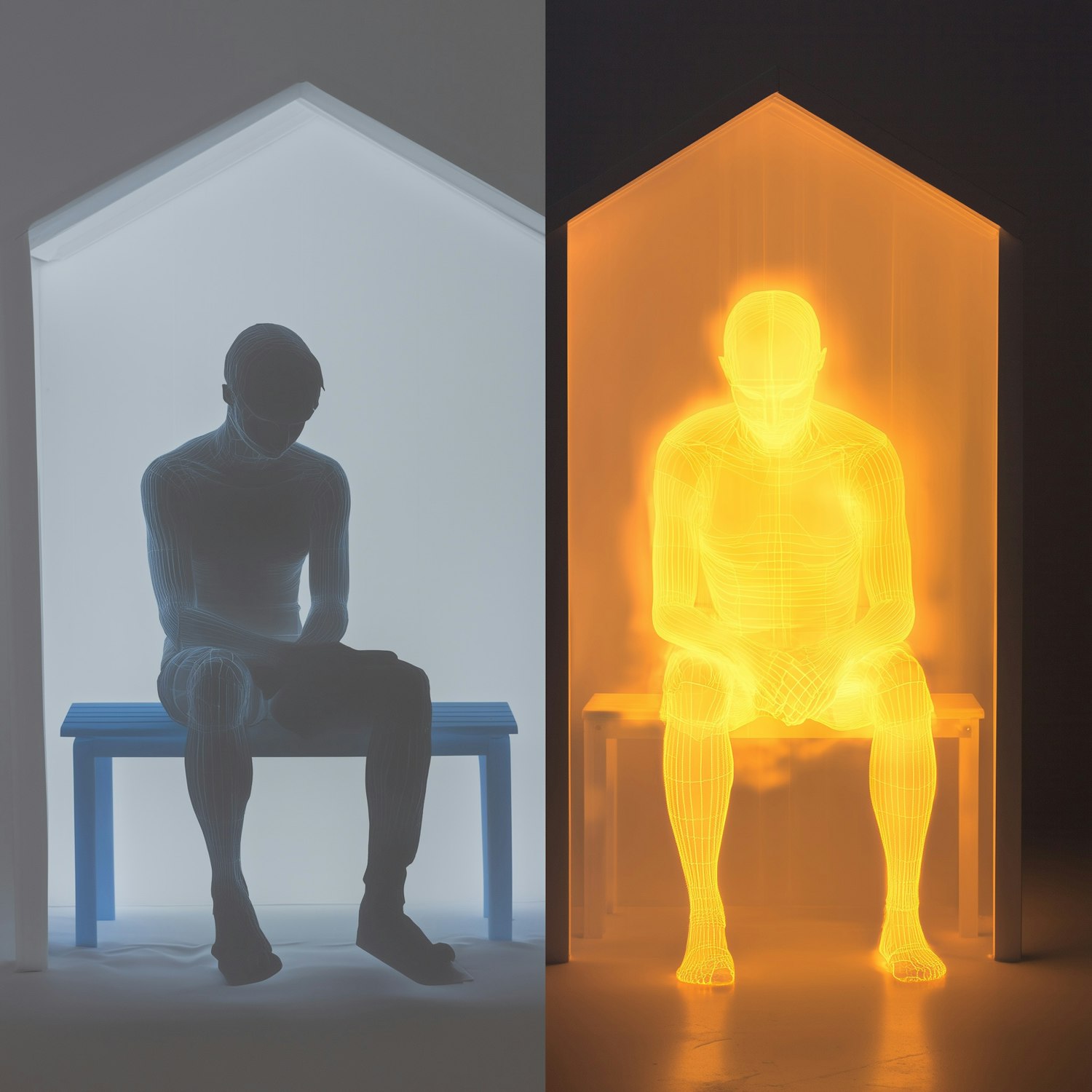 A split image of a wireframe figure on a bench, glowing blue on the left and orange on the right, symbolizing contrasting emotions or states.