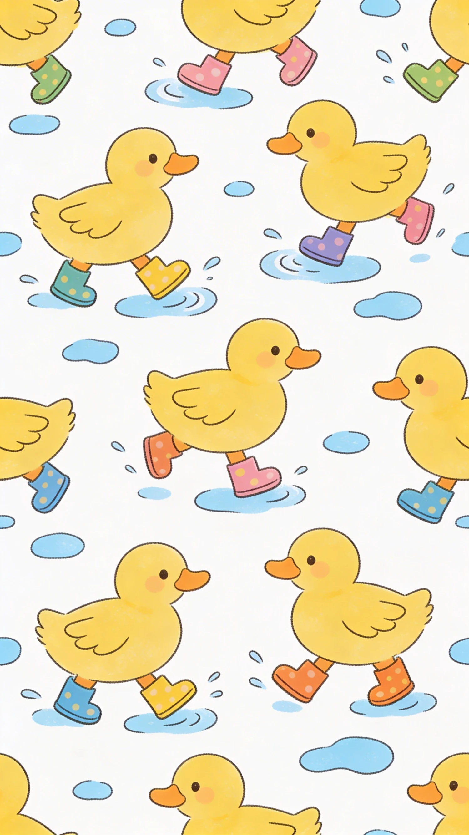 Cute cartoon ducks in colorful rain boots walking through puddles, perfect for a playful and cheerful design.