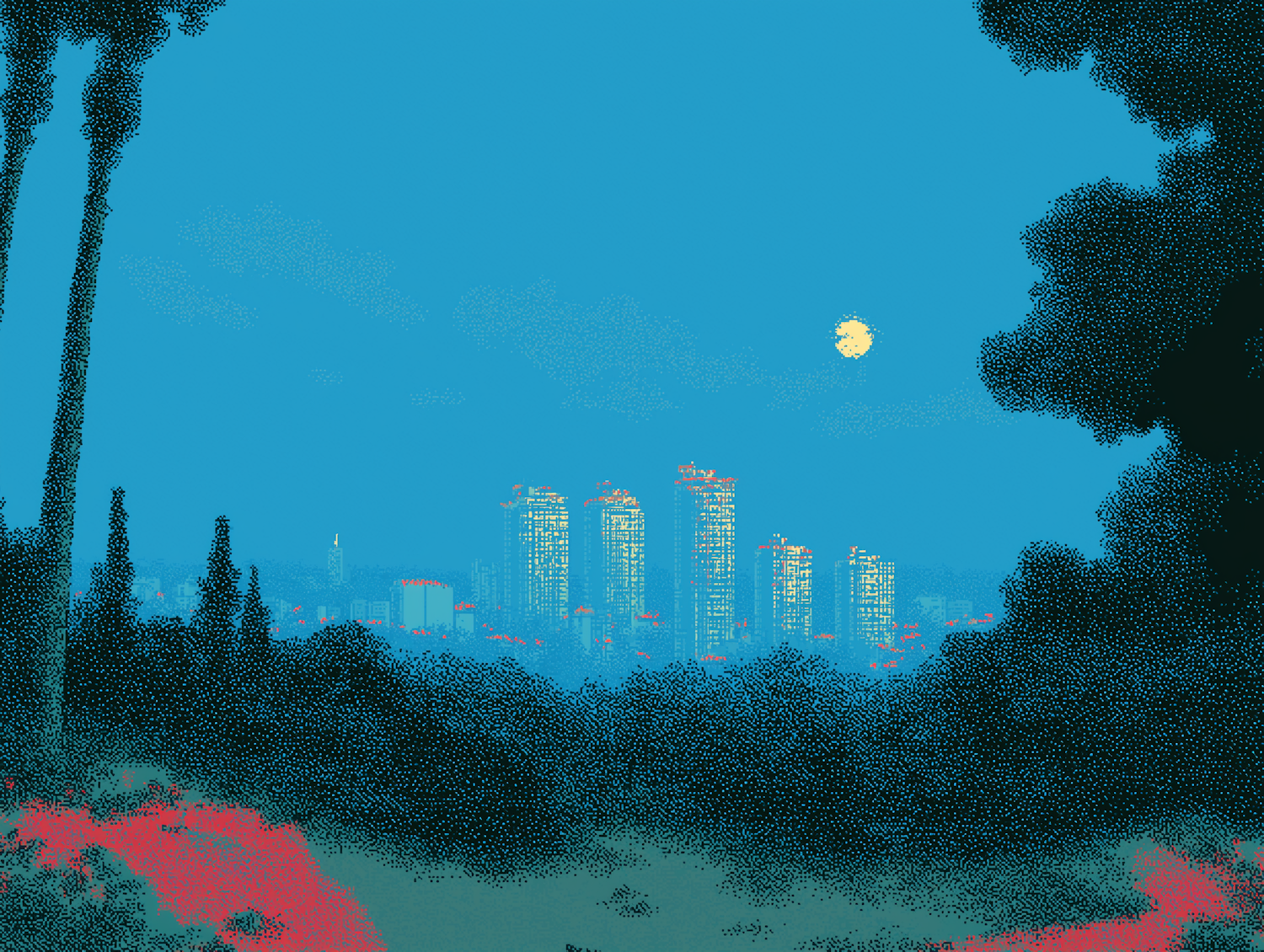 A pointillist-style cityscape at dusk, with illuminated buildings framed by trees and a full moon in a serene blue sky.