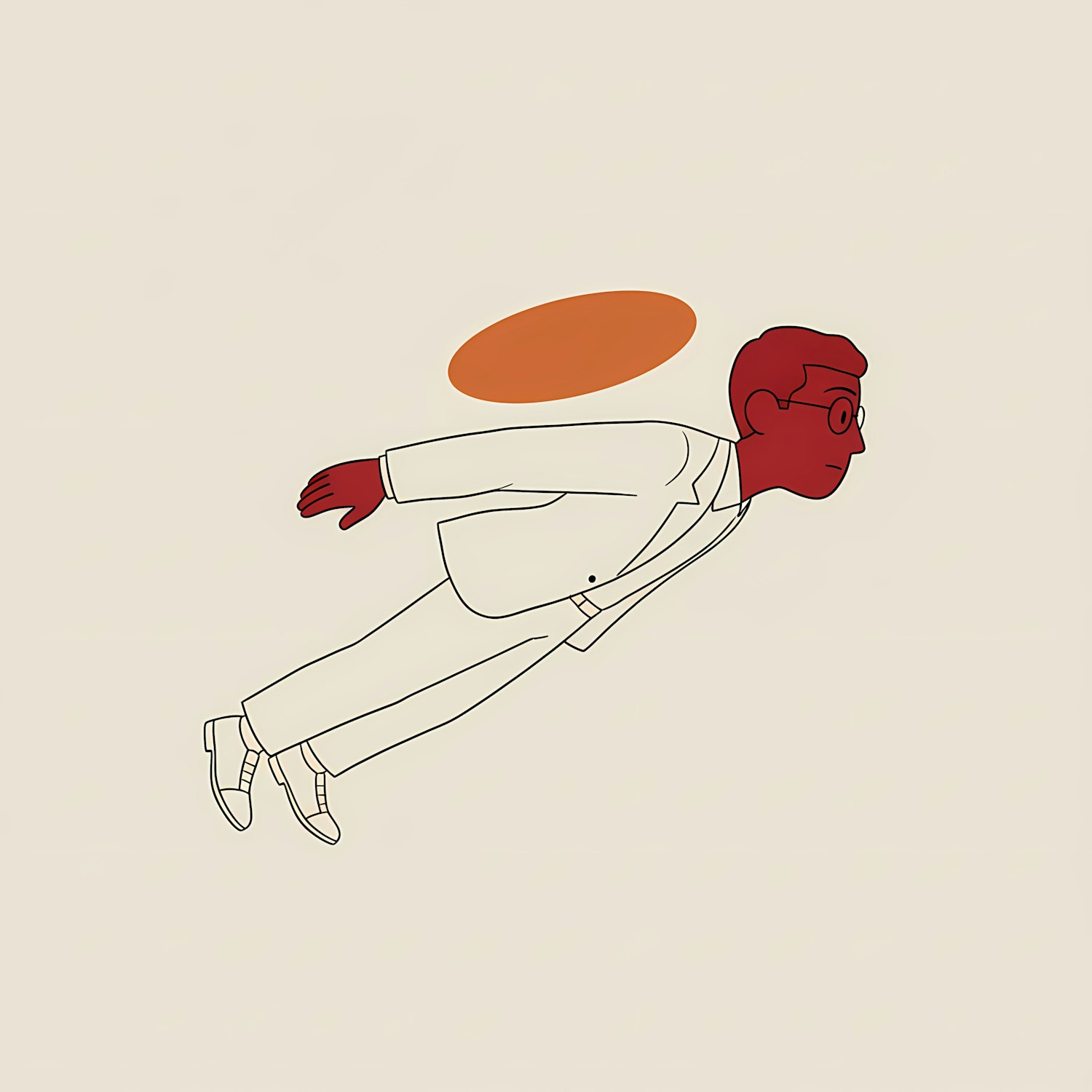 Minimalist illustration of a person in a white suit with a red face and an orange oval accent, set against a beige background.