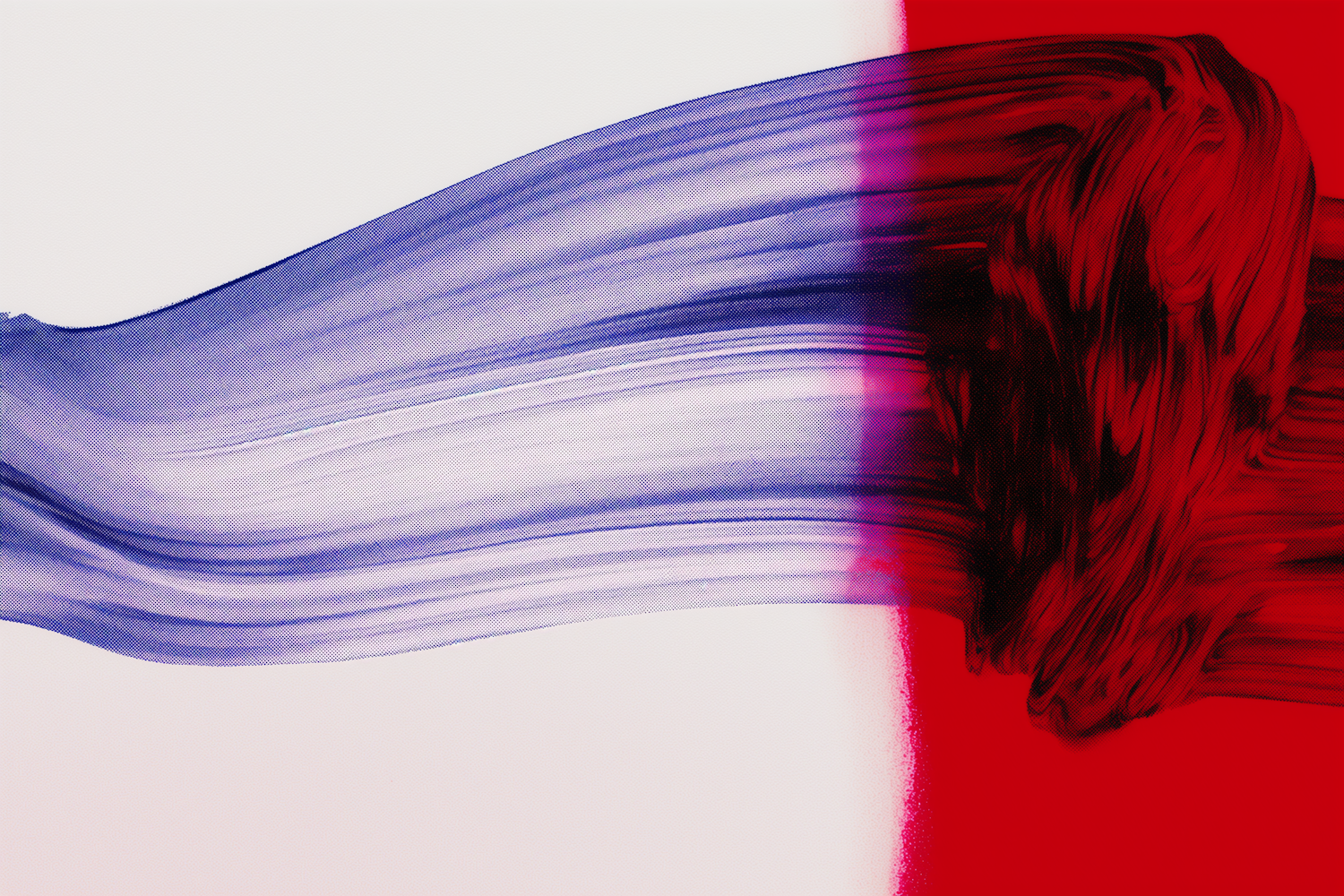 Bold abstract brushstroke blending blue and red with a striking purple transition on a clean white background. Dynamic and textured design.
