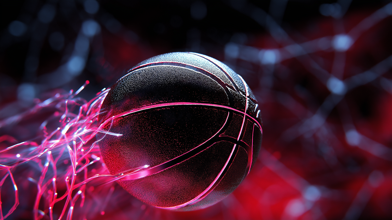 Futuristic basketball with glowing red seams and energy trails, set against a dark, dynamic background for a high-tech sports vibe.