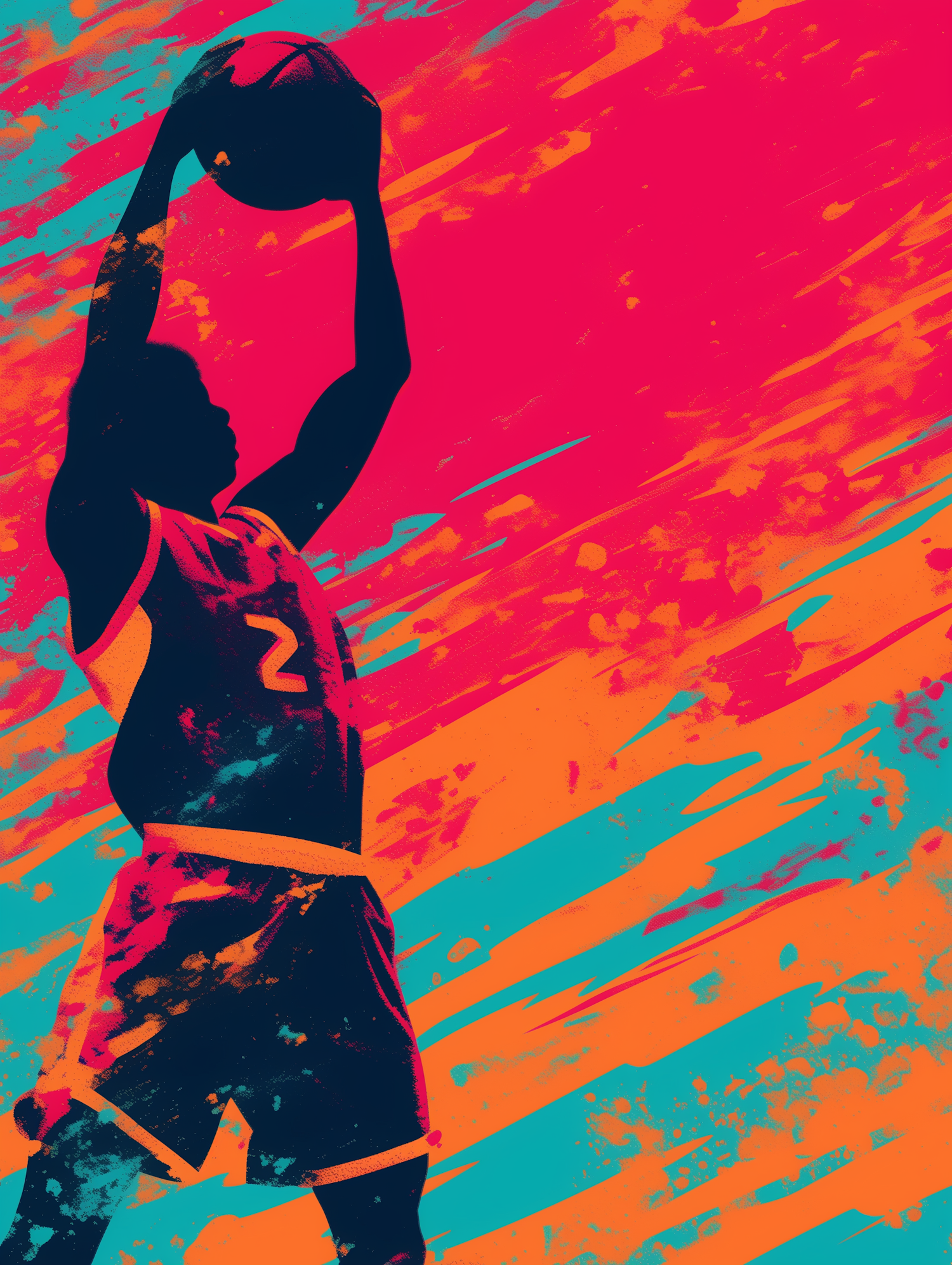 Vibrant illustration of a basketball player in silhouette against a colorful abstract background, capturing dynamic movement and energy.