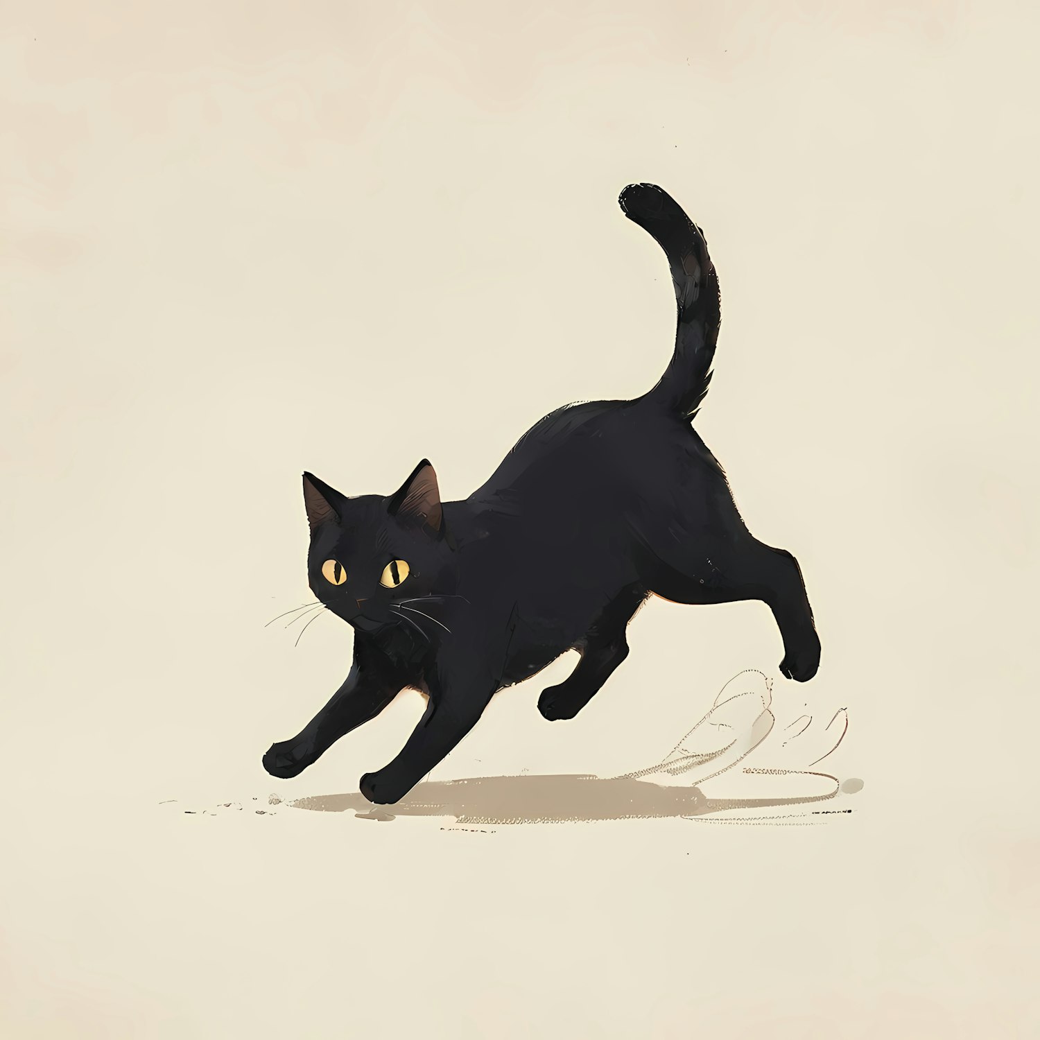 Illustration of a playful black cat with bright yellow eyes, captured mid-stride on a neutral beige background.