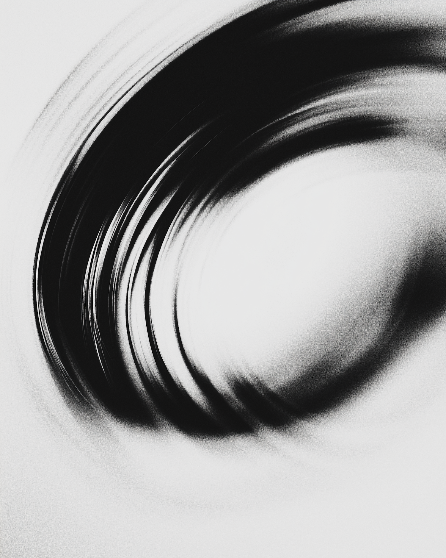 Abstract black swirl on white background, evoking motion and fluidity with blurred edges and minimalist design.