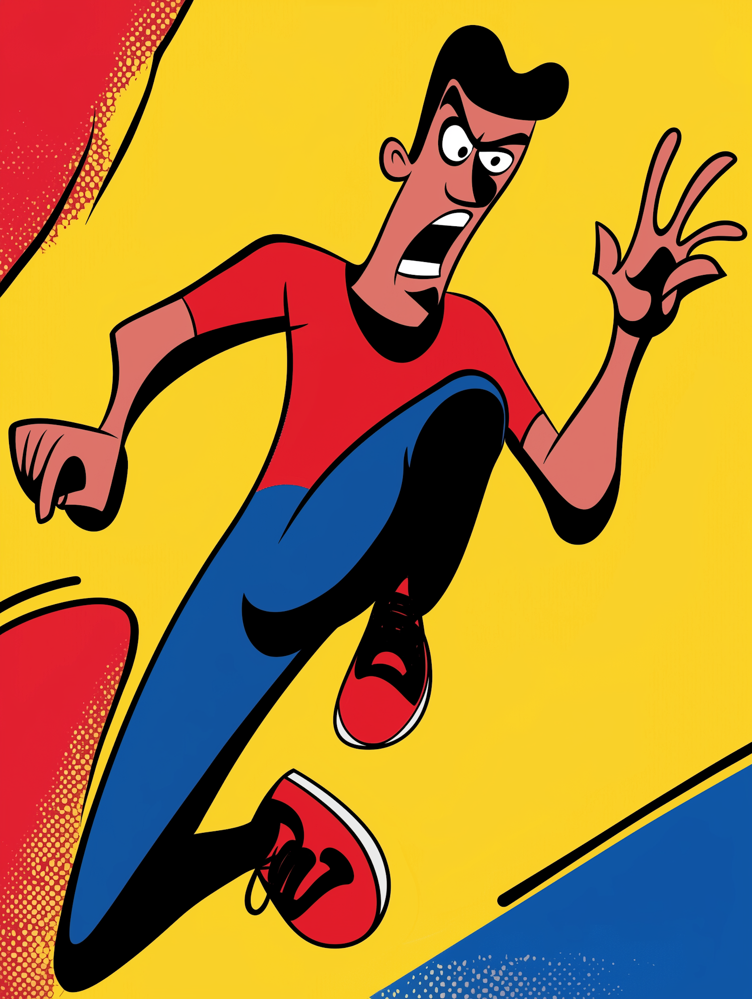 Dynamic cartoon character in action pose with red shirt and sneakers, set against a vibrant yellow background with abstract shapes.