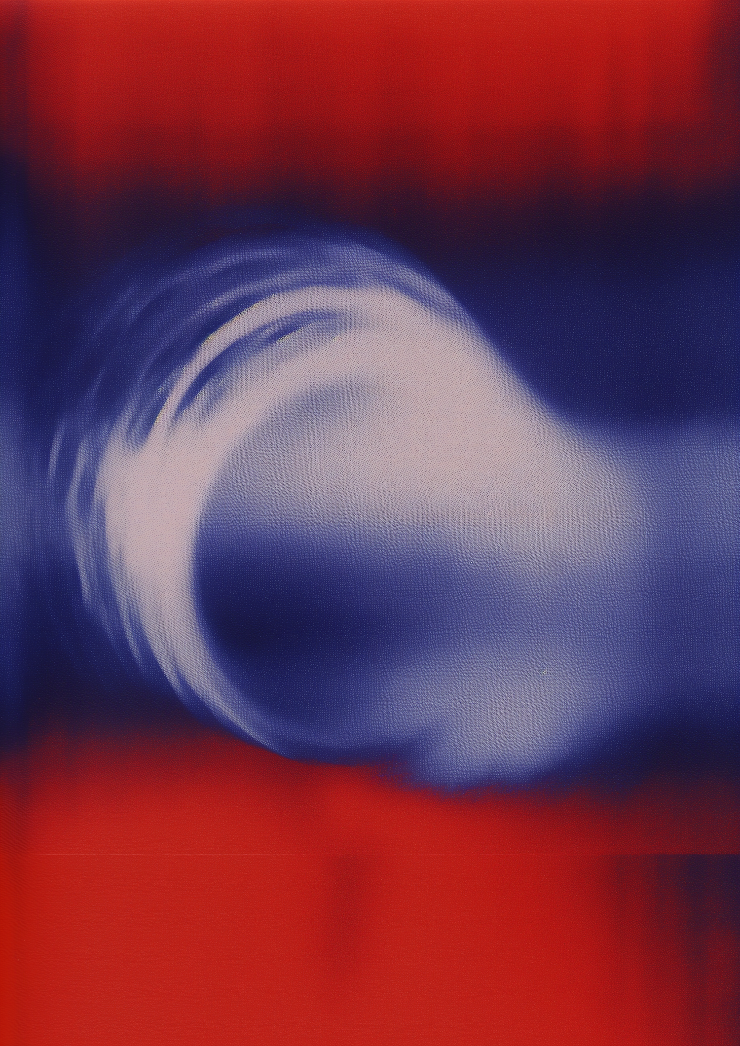 Abstract art with swirling blue and white forms against a red and blue gradient background, evoking motion and energy.