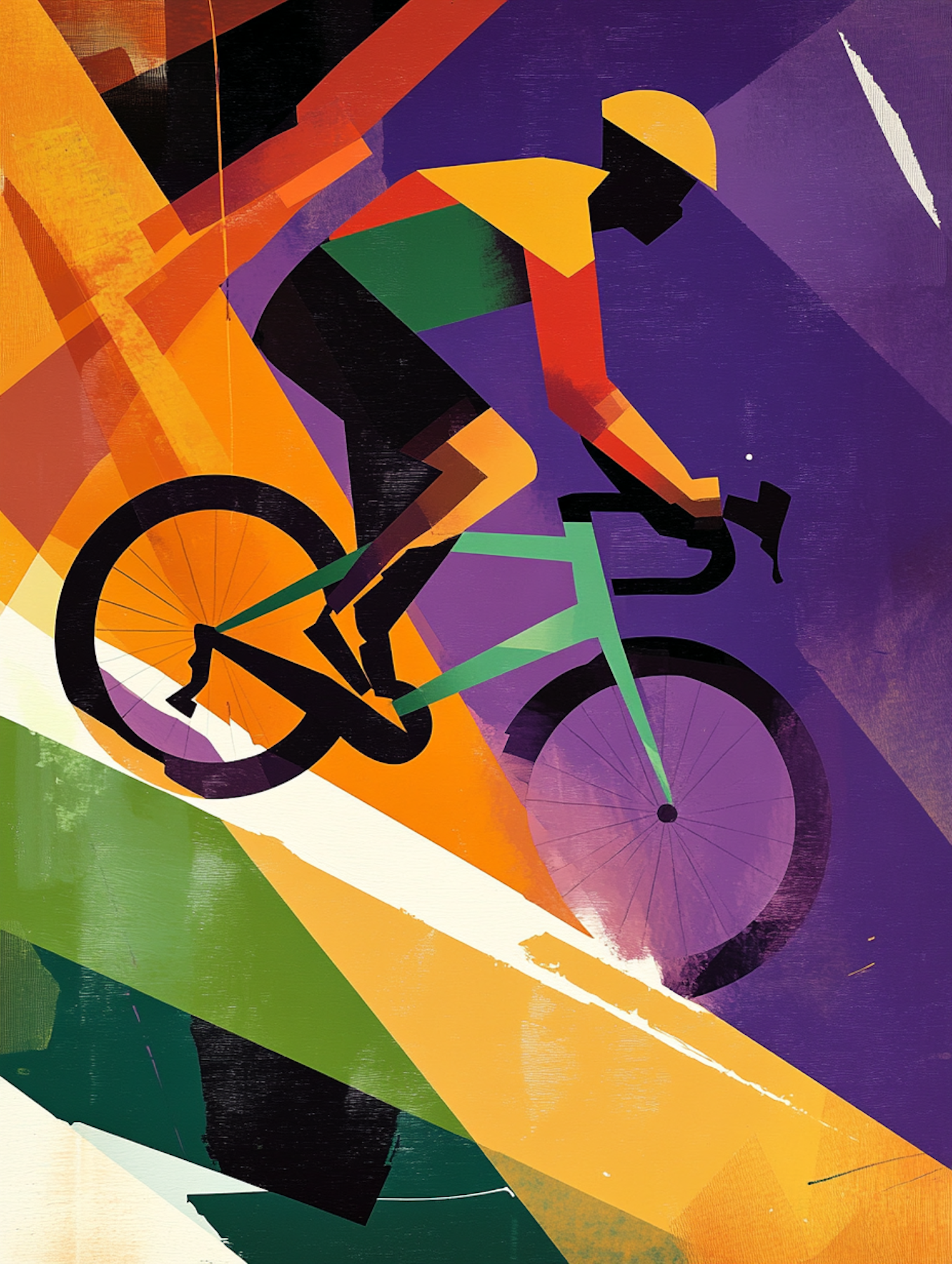 Vibrant abstract illustration of a cyclist in motion, featuring bold geometric shapes and dynamic colors like orange, purple, and green.
