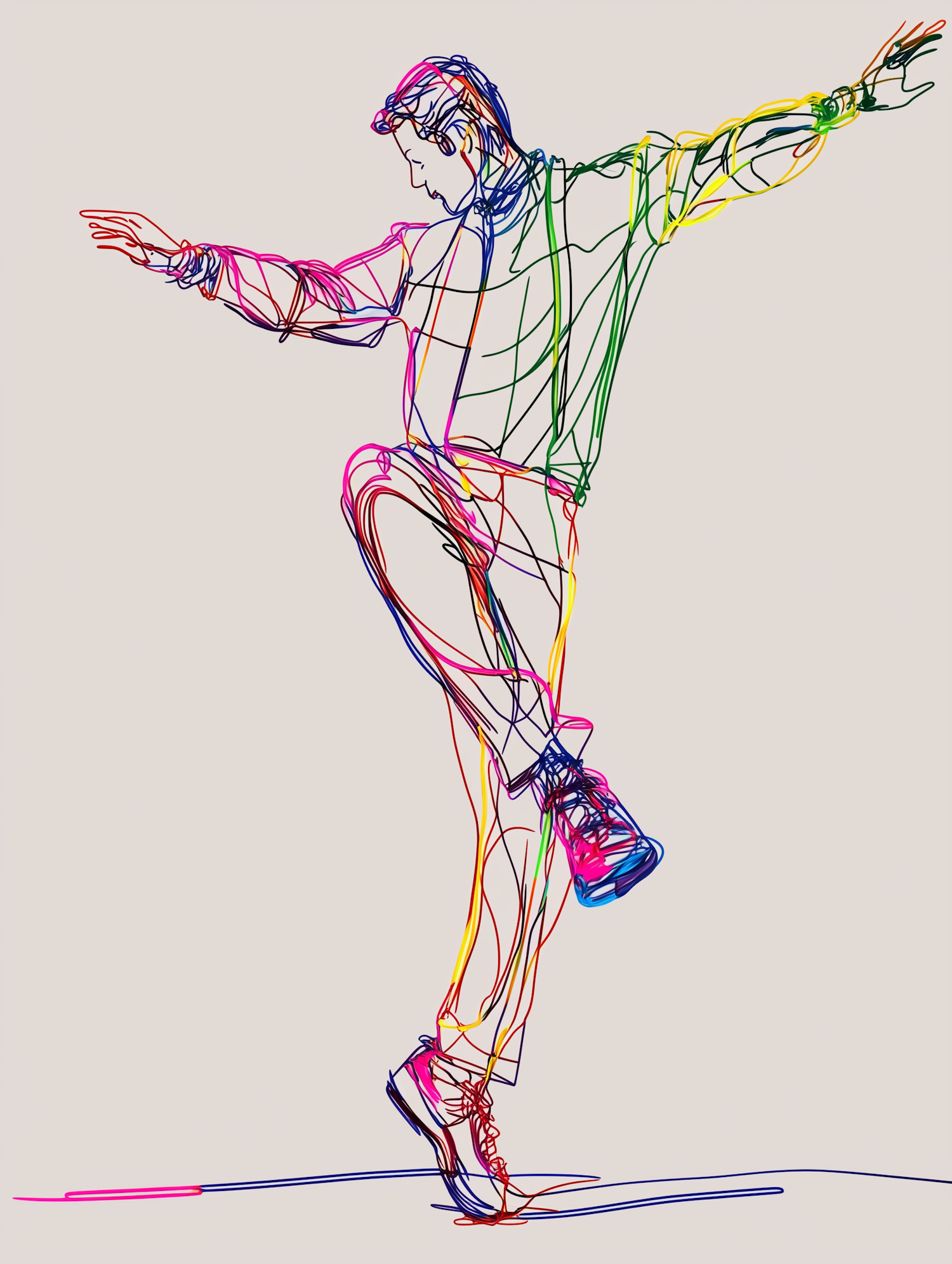 Dynamic line art of a dancer in motion, featuring vibrant multicolored lines on a neutral background, capturing energy and grace.