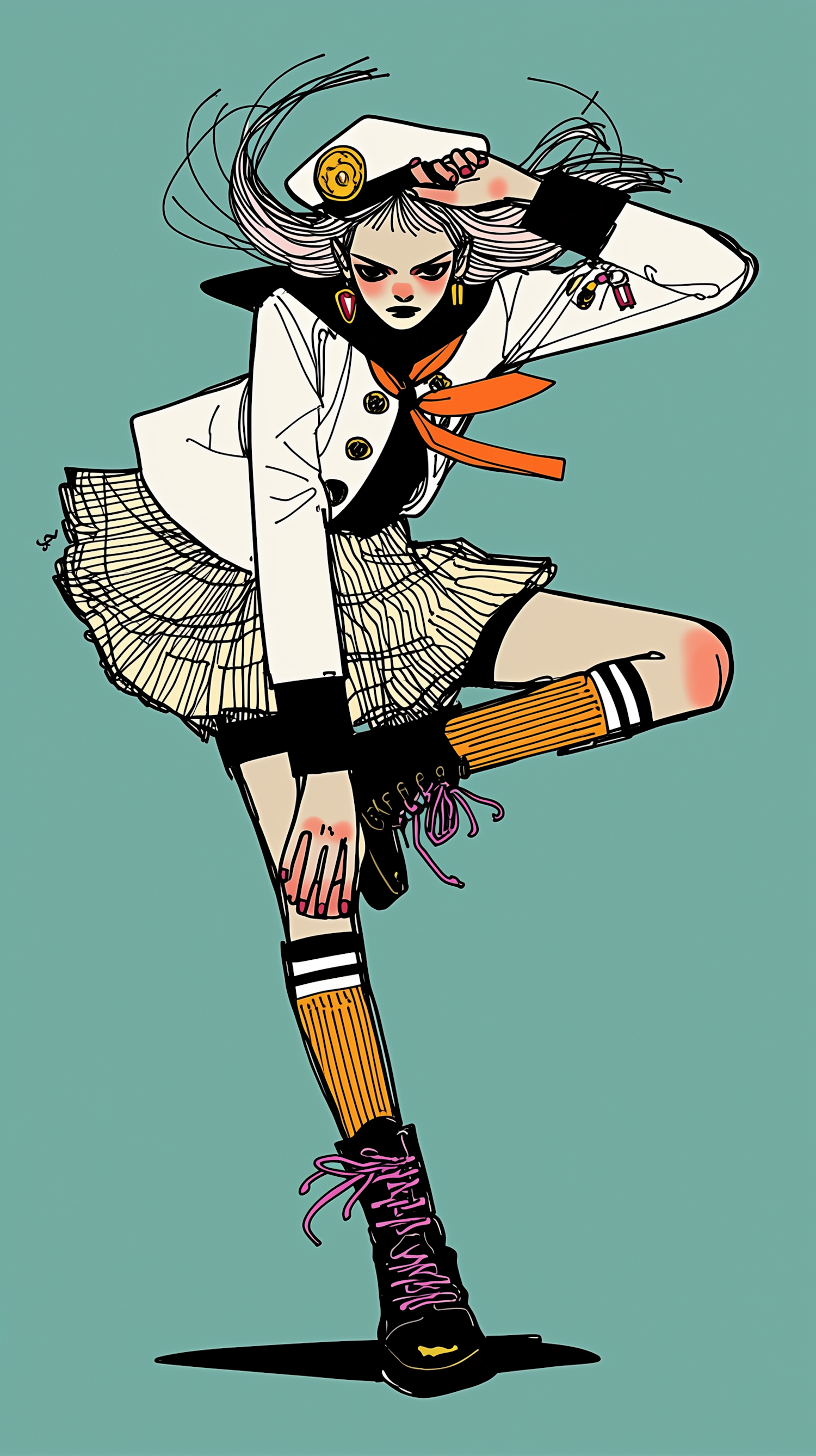 Stylized illustration of a dynamic character in a sailor-inspired outfit with bold colors and a teal background.
