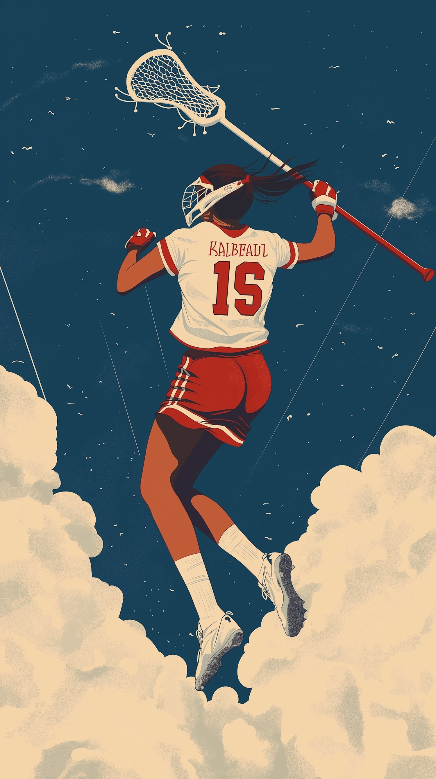 Illustration of a female lacrosse player flying through the sky, wearing a jersey with 'KALBEAUL' and number '15', surrounded by clouds.