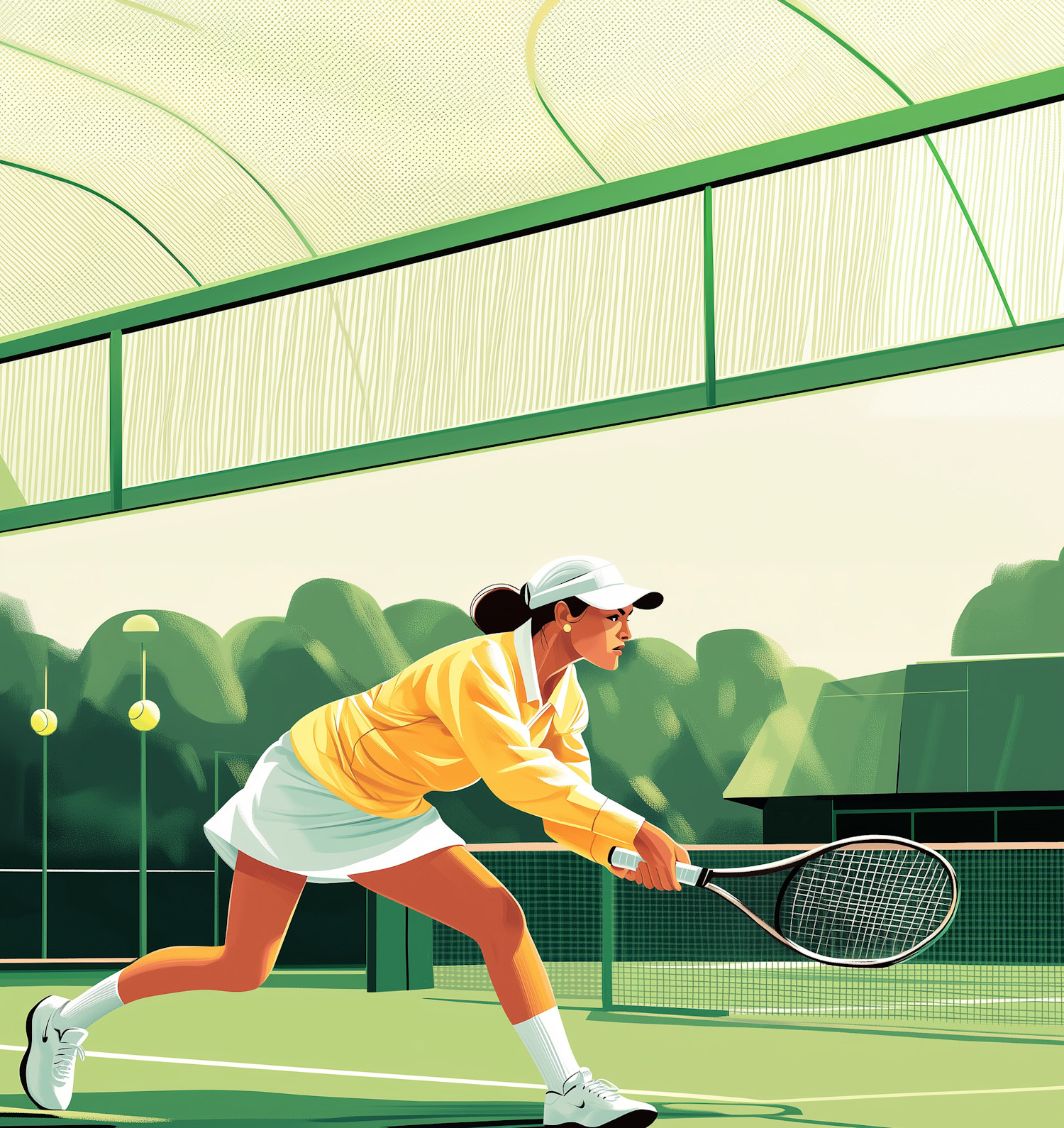 Illustration of a female tennis player in action, wearing a yellow jacket and white skirt, poised with a racket on a sunlit court.