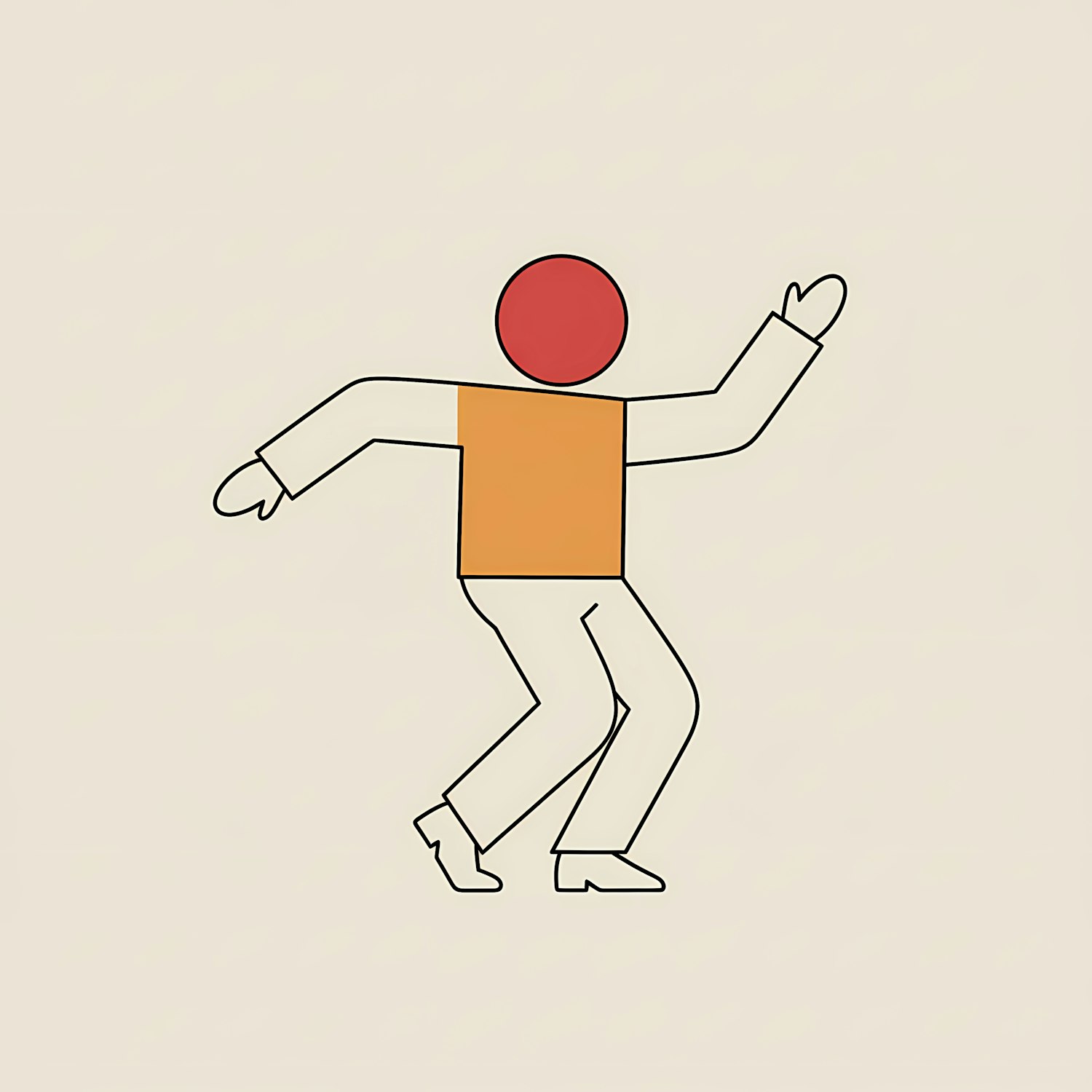 Minimalist illustration of a geometric figure in motion, featuring a red head, orange torso, and white limbs on a beige background.