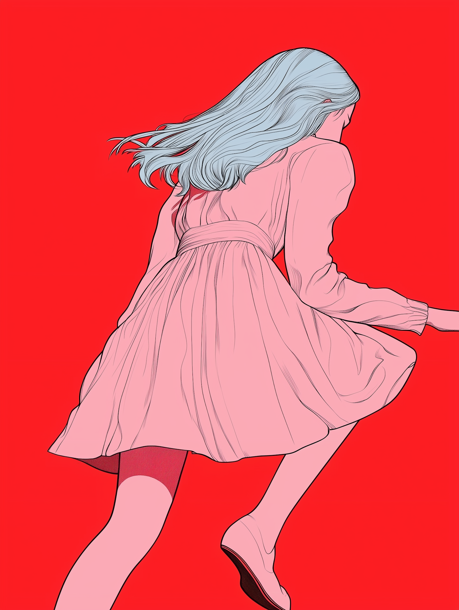 Stylized illustration of a woman with blue hair in a pink dress, set against a bold red background, showcasing dynamic motion.