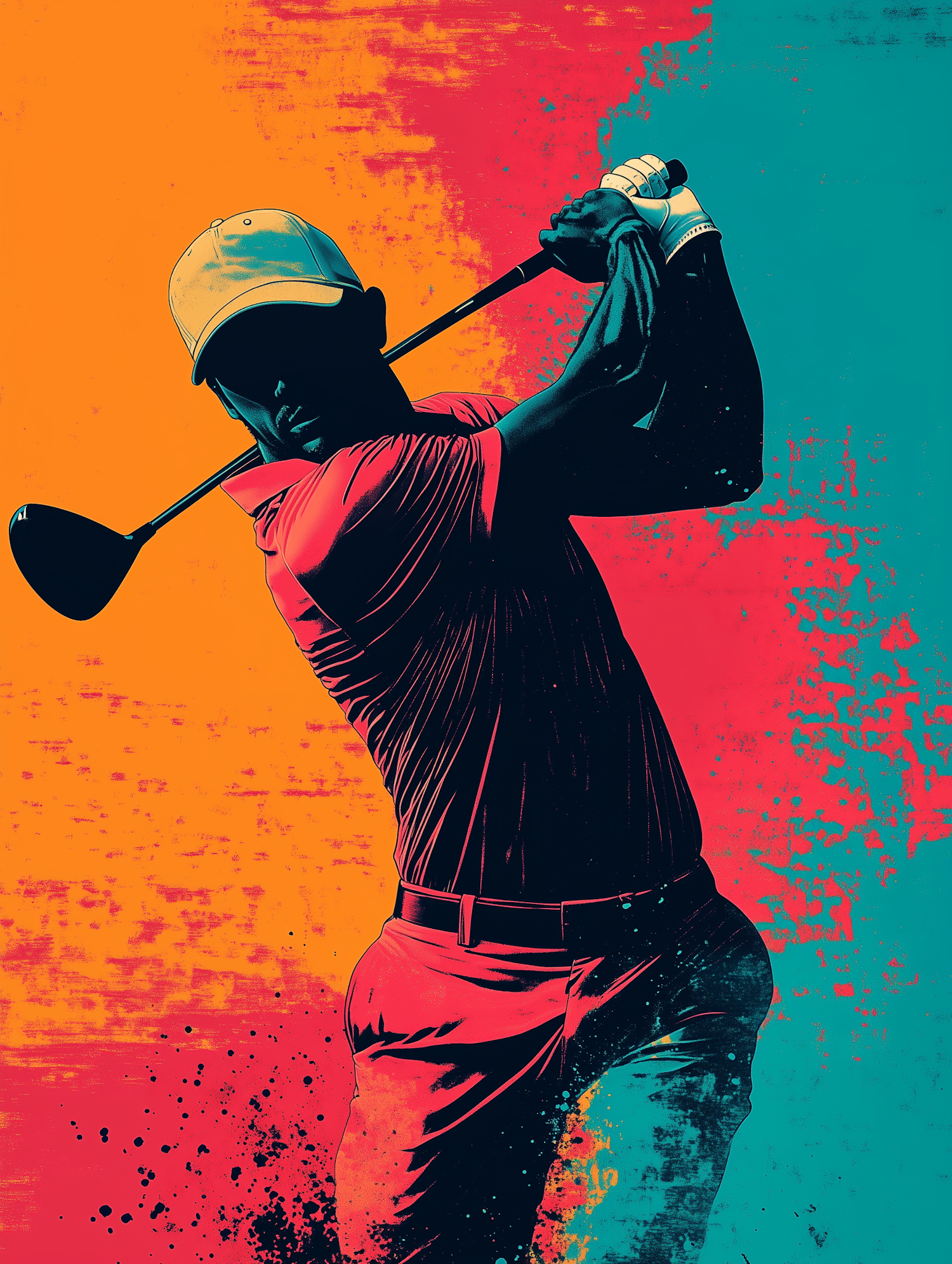 Vibrant illustration of a golfer mid-swing, set against a bold orange and teal background with dynamic color splashes.