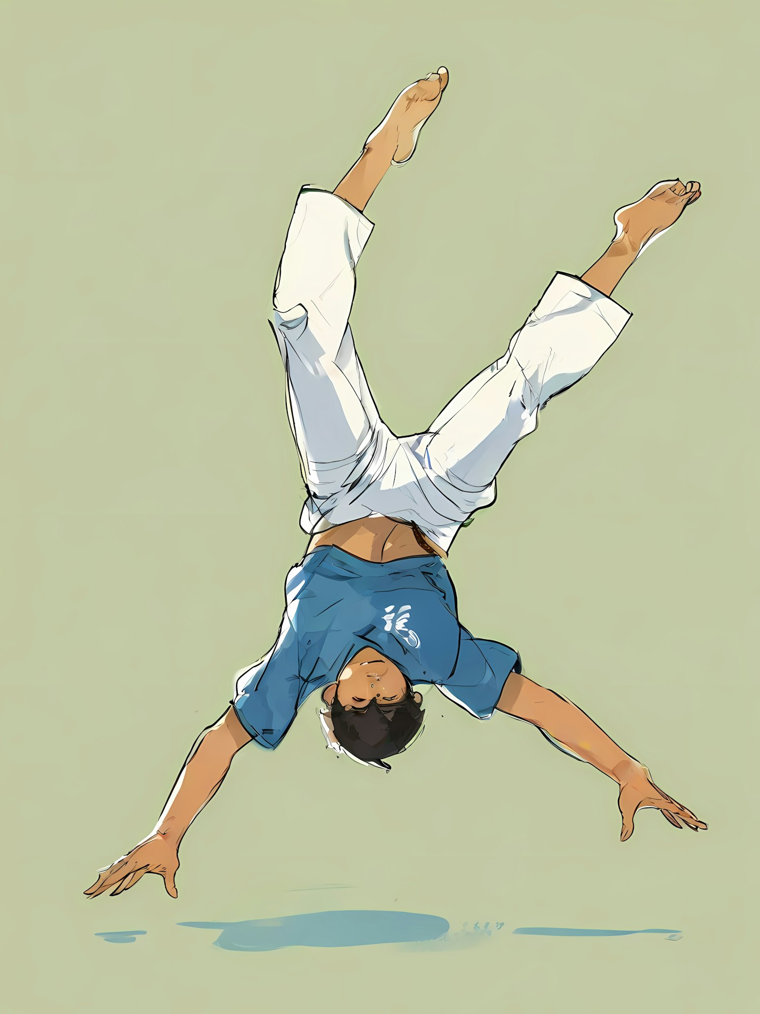 Dynamic handstand illustration with a person in blue shirt and white pants on a light green background, showcasing athleticism.