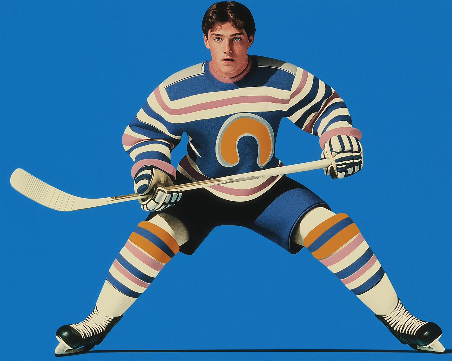 Dynamic illustration of a hockey player in a colorful uniform with bold stripes, poised with a hockey stick against a blue background.