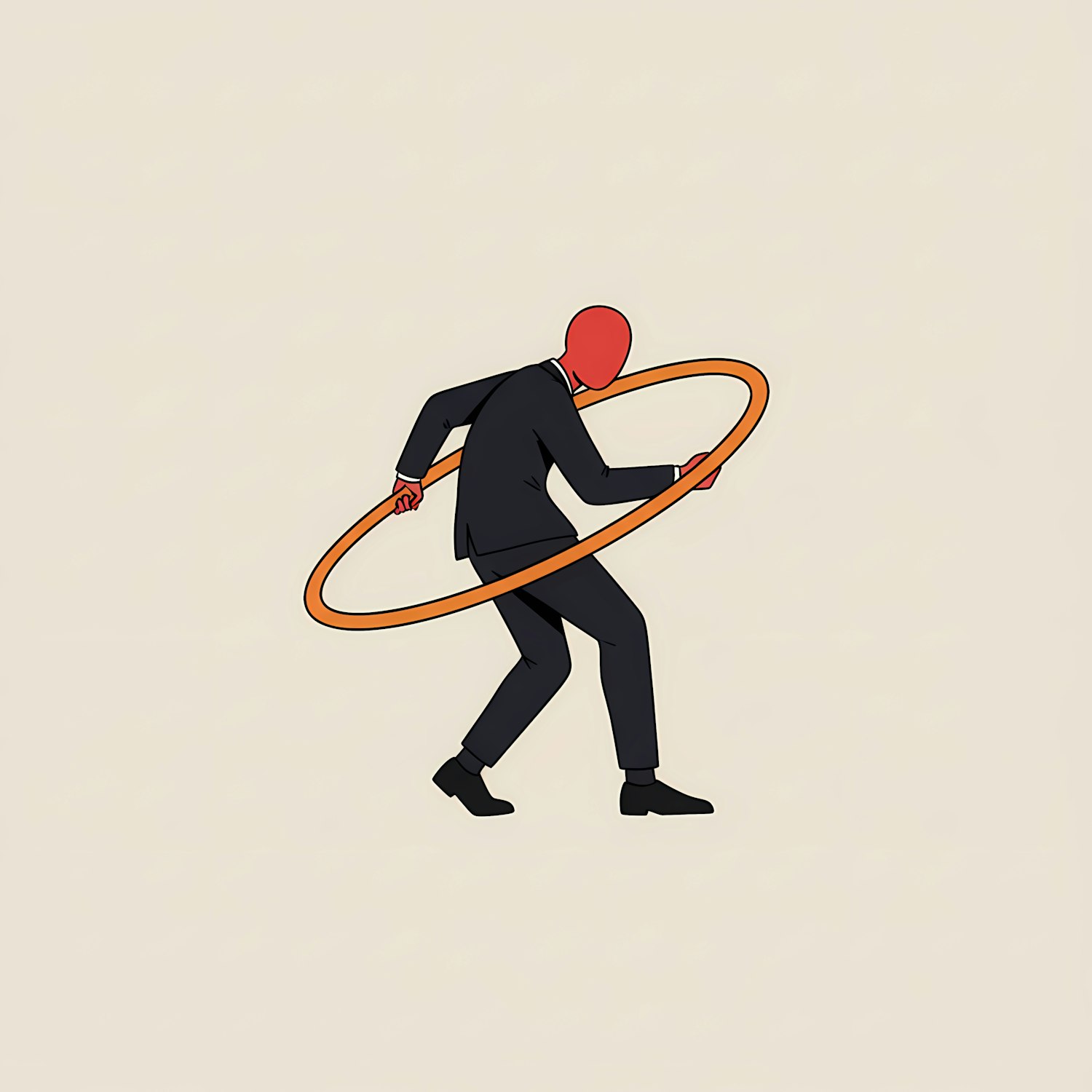 Minimalist illustration of a figure in a suit with a red head holding an orange hoop, set against a light beige background.