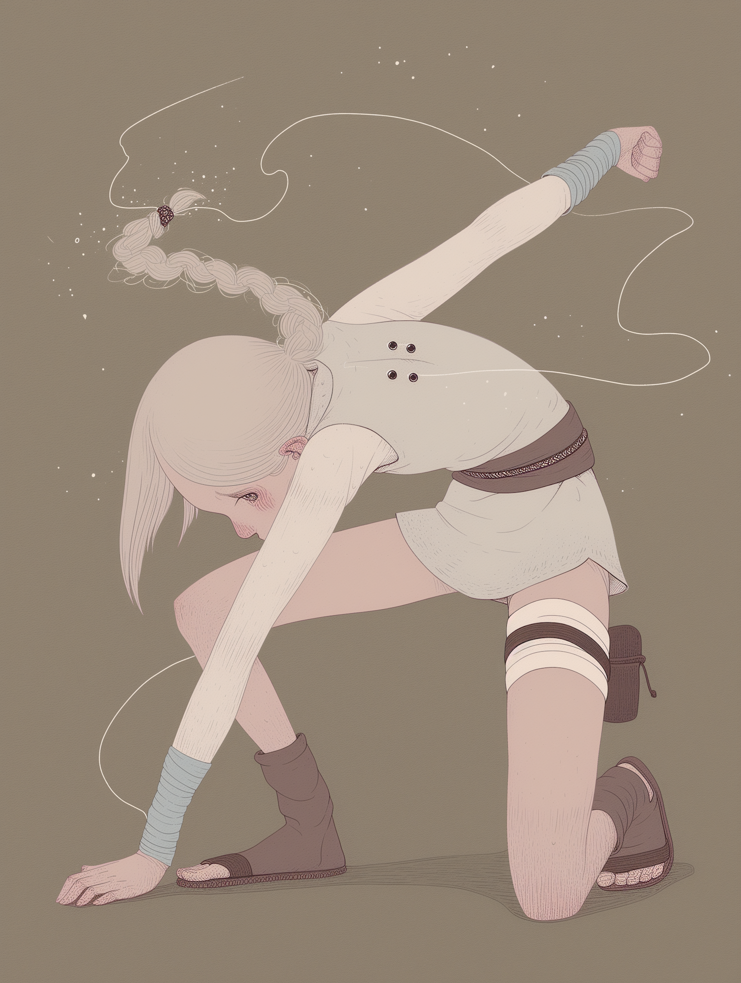 Stylized illustration of a dynamic figure kneeling with a braid, light tunic, and sparkles on a muted olive-green background.