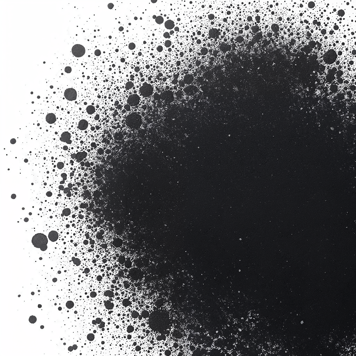 Abstract black ink splatters on white background, creating a dynamic and chaotic pattern with varying sizes and a gradient effect.