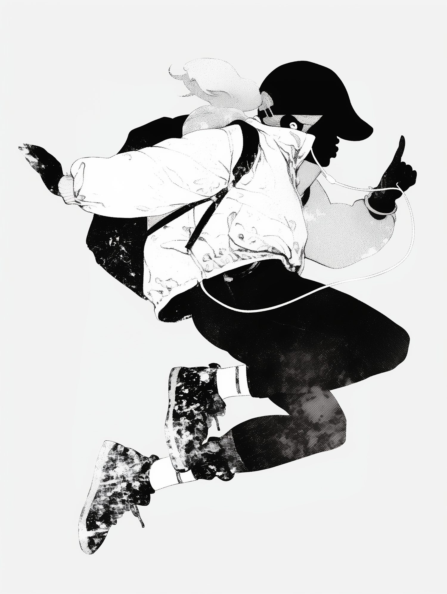 Dynamic monochrome illustration of a person jumping with headphones, cap, and backpack, pointing upwards. Energetic and stylish design.