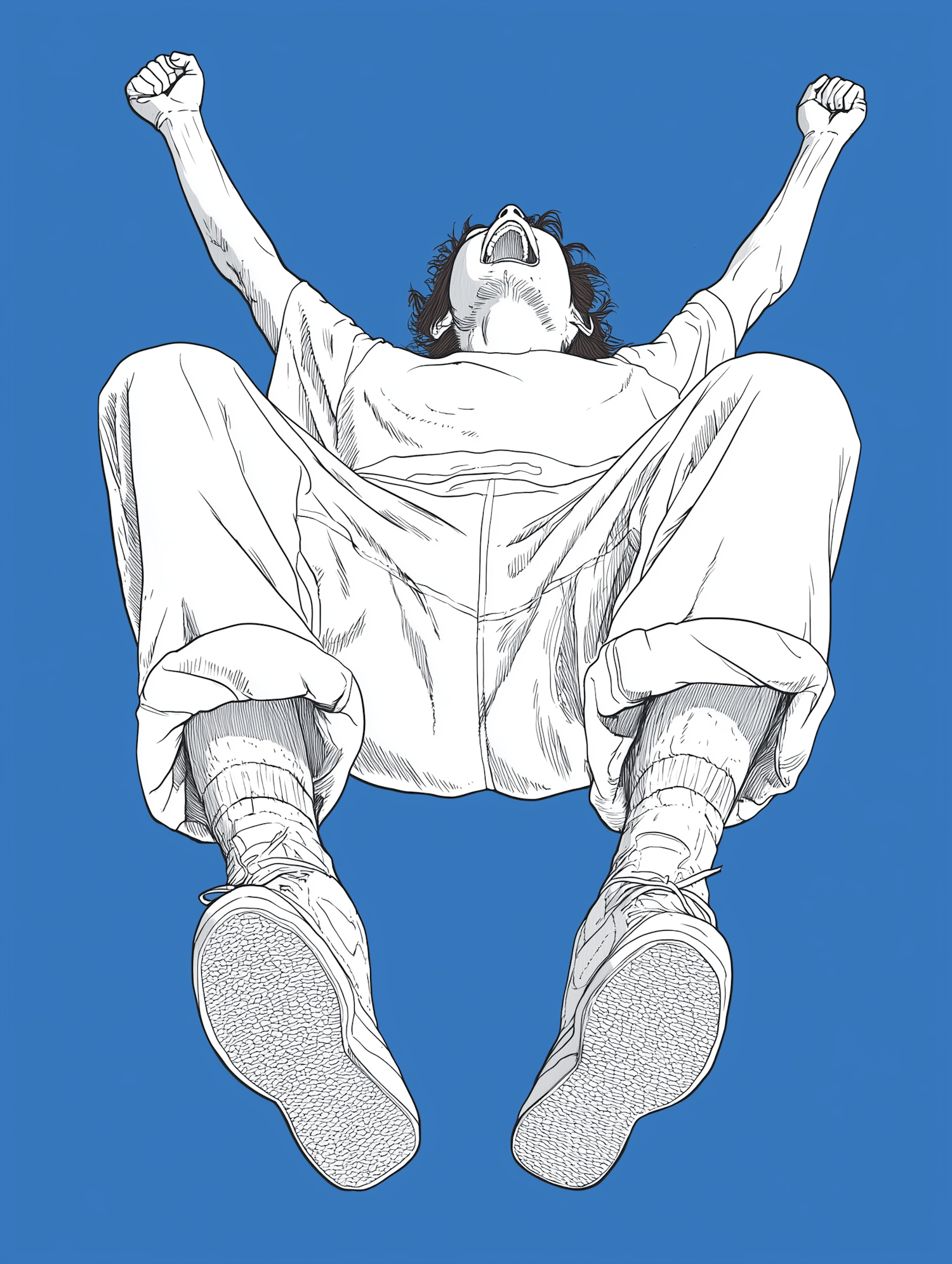 Dynamic illustration of a person in a triumphant pose with raised fists, set against a solid blue background.