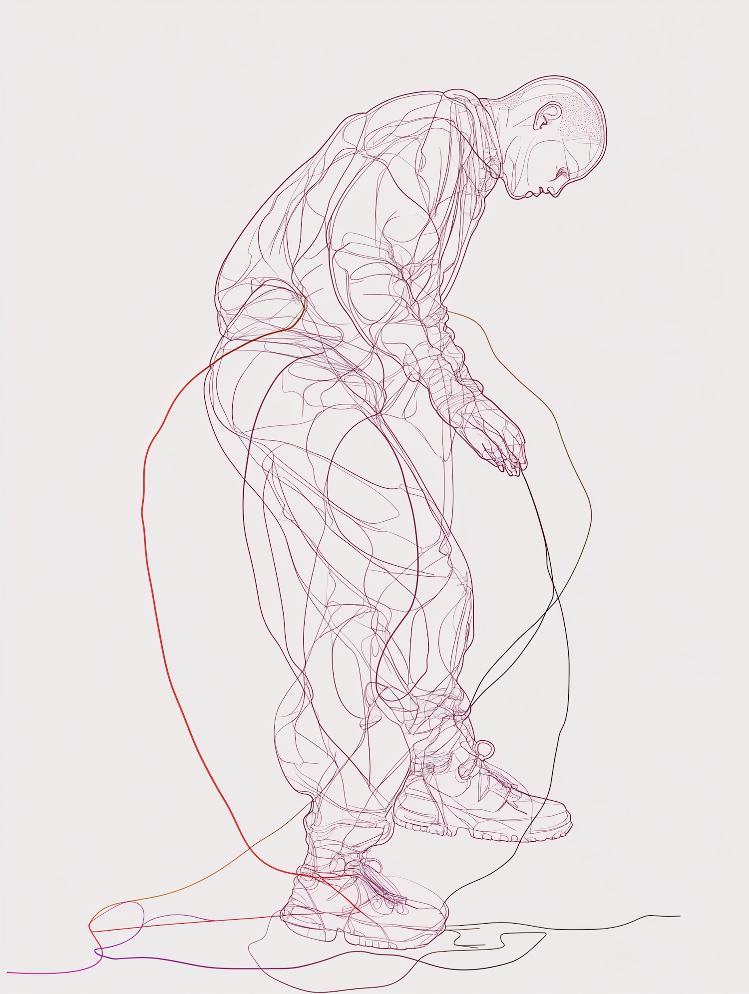 Minimalist line art of a crouched figure in casual wear, created with dynamic, overlapping lines in red, orange, and purple hues.