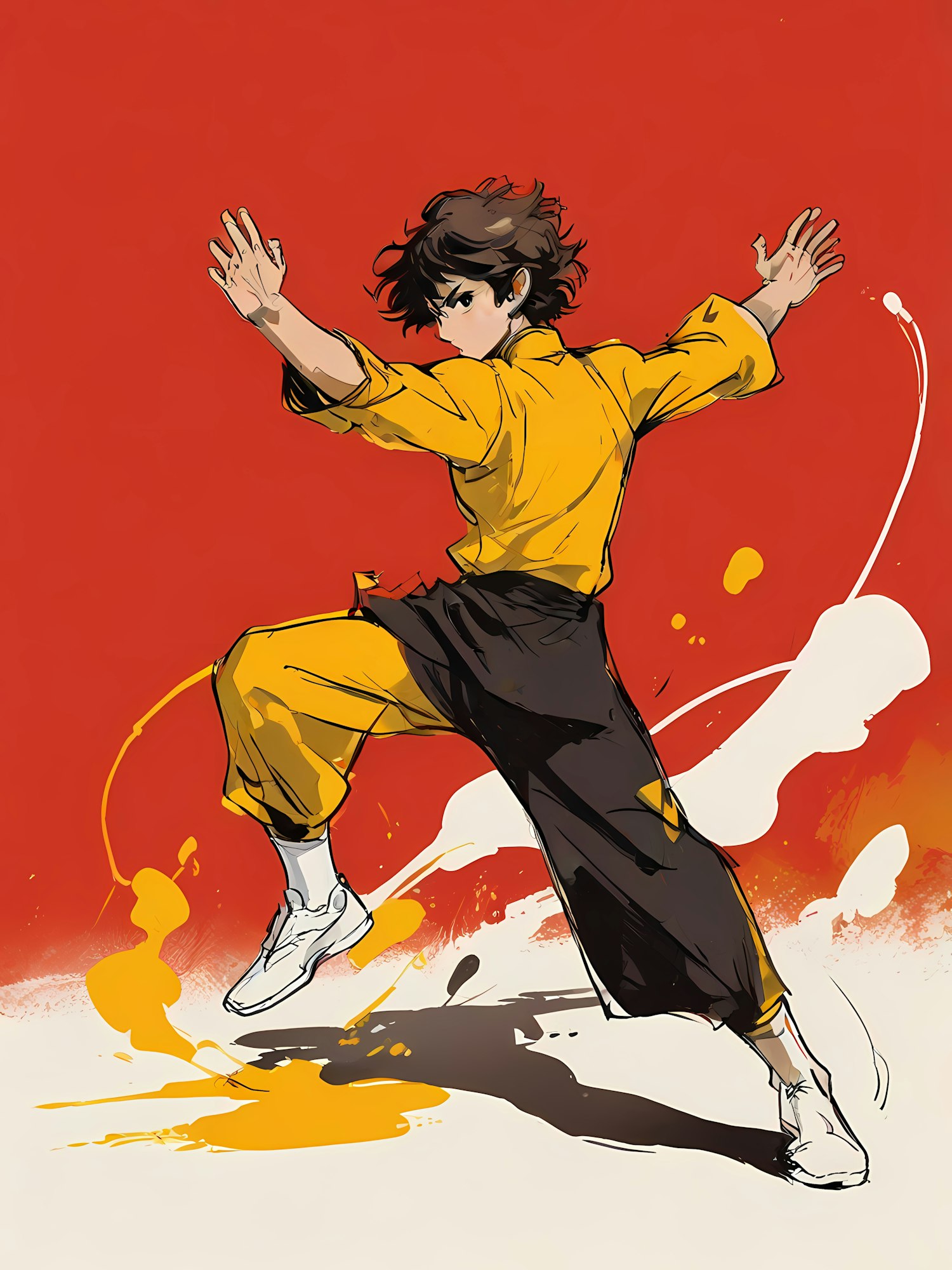 Dynamic martial artist illustration with bold colors and fluid motion, featuring a character in a yellow top against a red background.