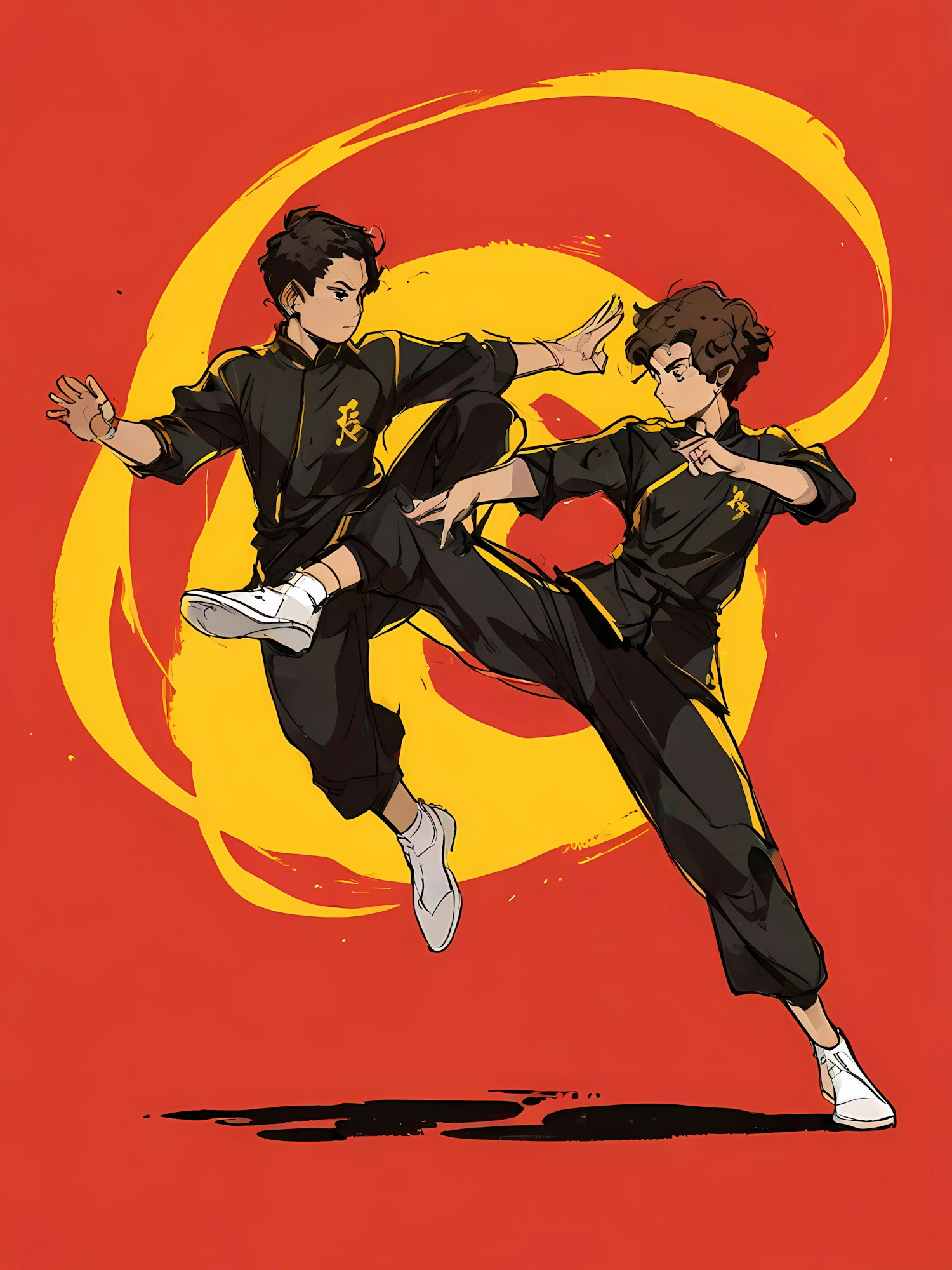 Two animated characters in martial arts poses on a red and yellow background, showcasing dynamic movement and focus.