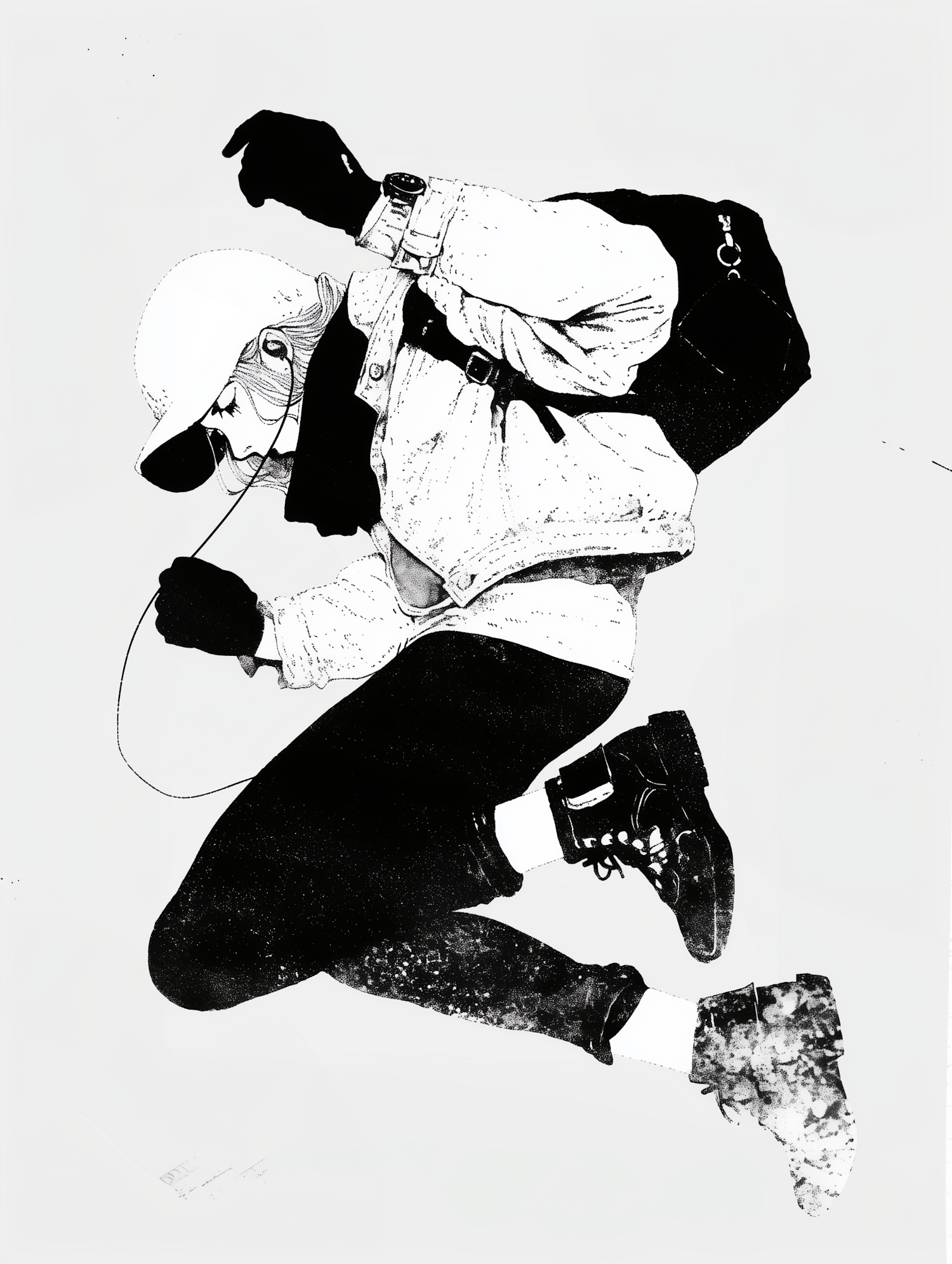 Dynamic monochrome illustration of a person in mid-air, wearing a cap, jacket, and backpack, with earphones and rugged footwear.