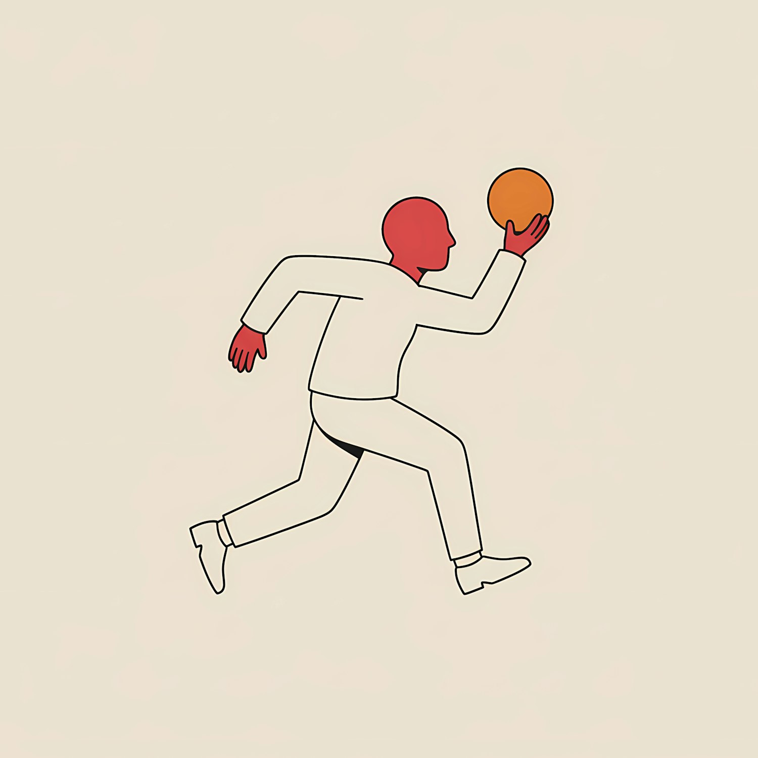 Minimalist illustration of a person running with an orange ball, featuring bold colors and clean lines on a beige background.