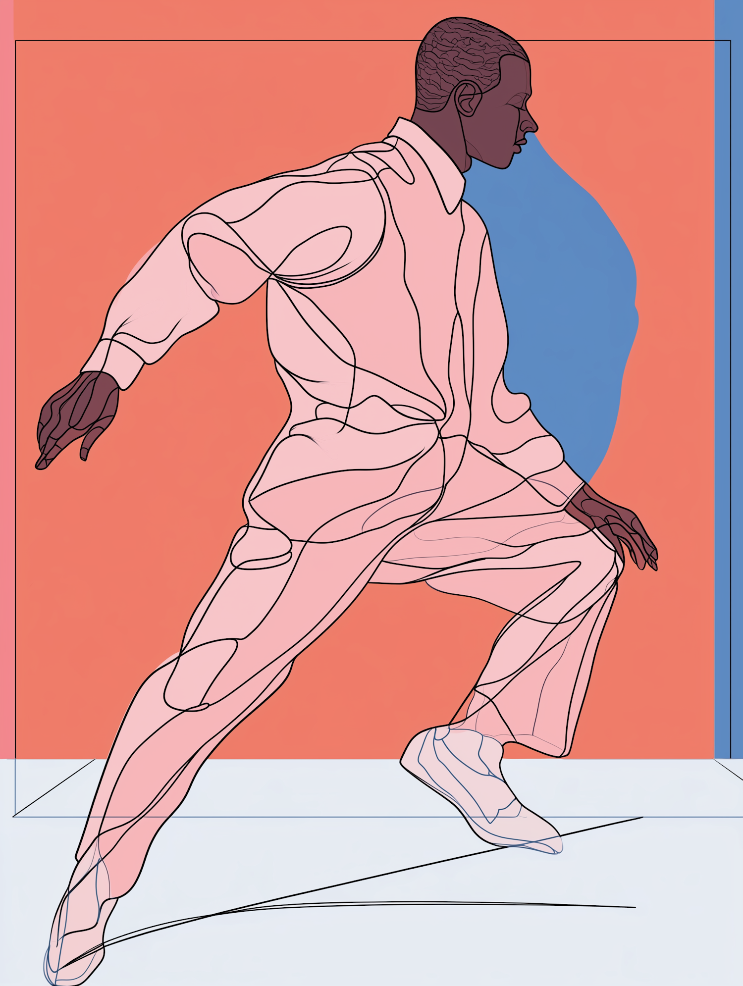 Stylized illustration of a Black man in motion, wearing a pink outfit against a vibrant orange and blue background.