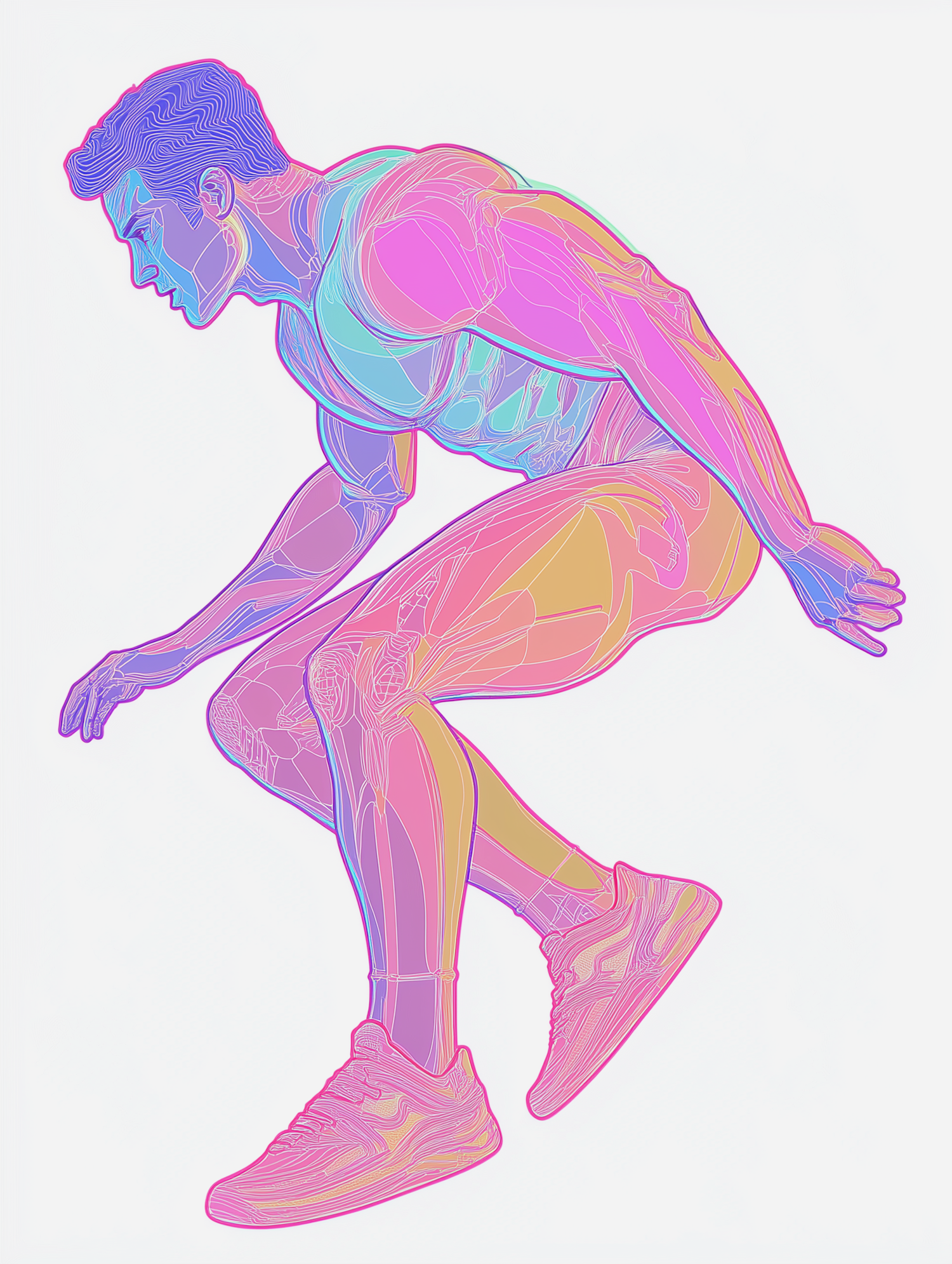 Dynamic neon illustration of a crouching male figure, highlighting muscular anatomy with vibrant colors and intricate line work.